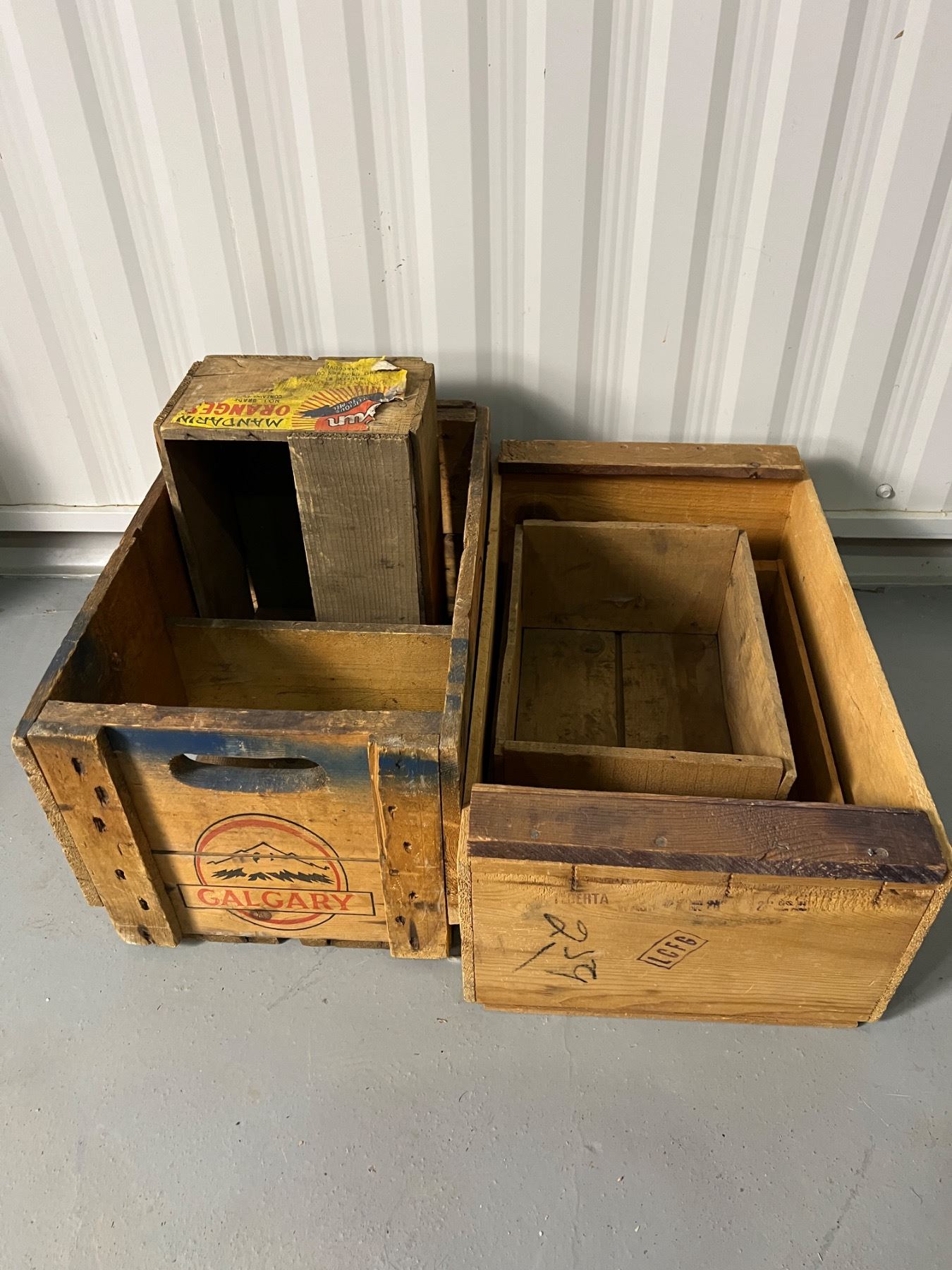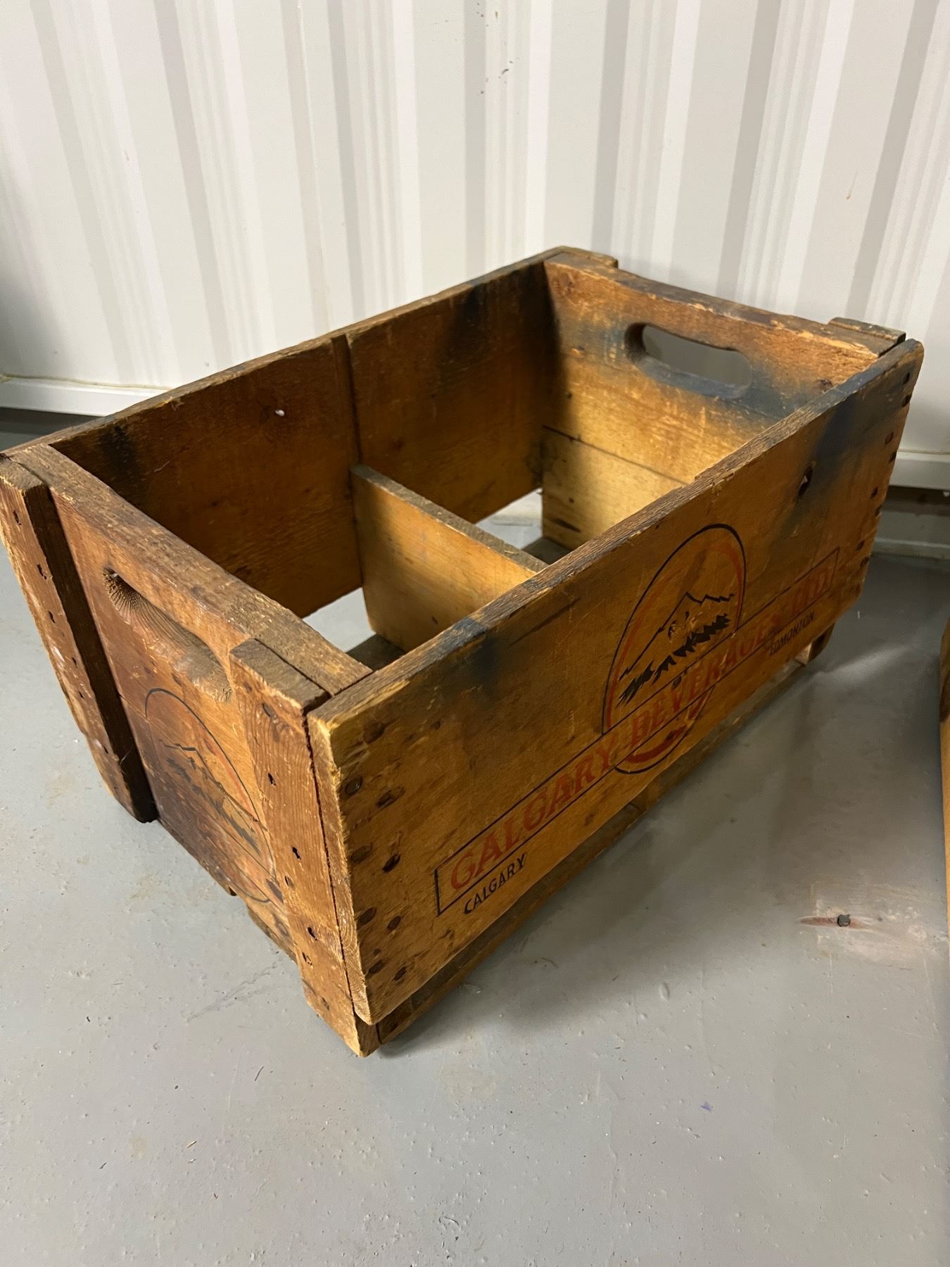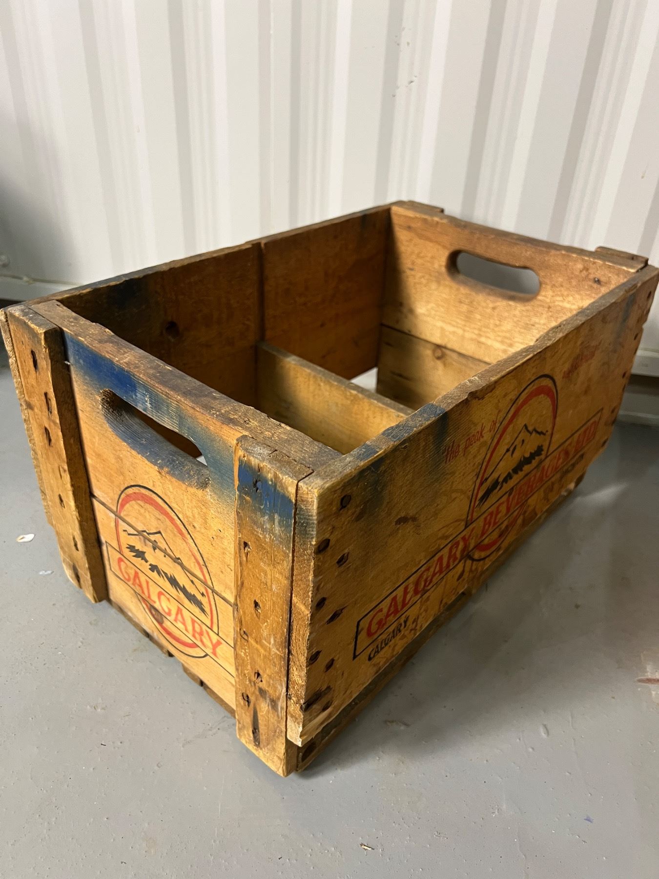Some wear and tear, the Calgary Beverages crate is 18"L x 11"W x 10"H