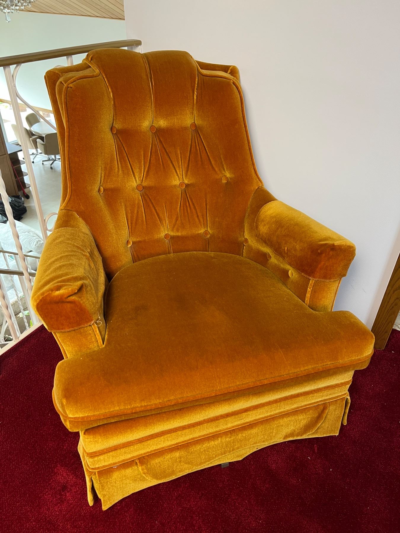 The seat cushion is in good condition, has a small stain on the top, swivels,
