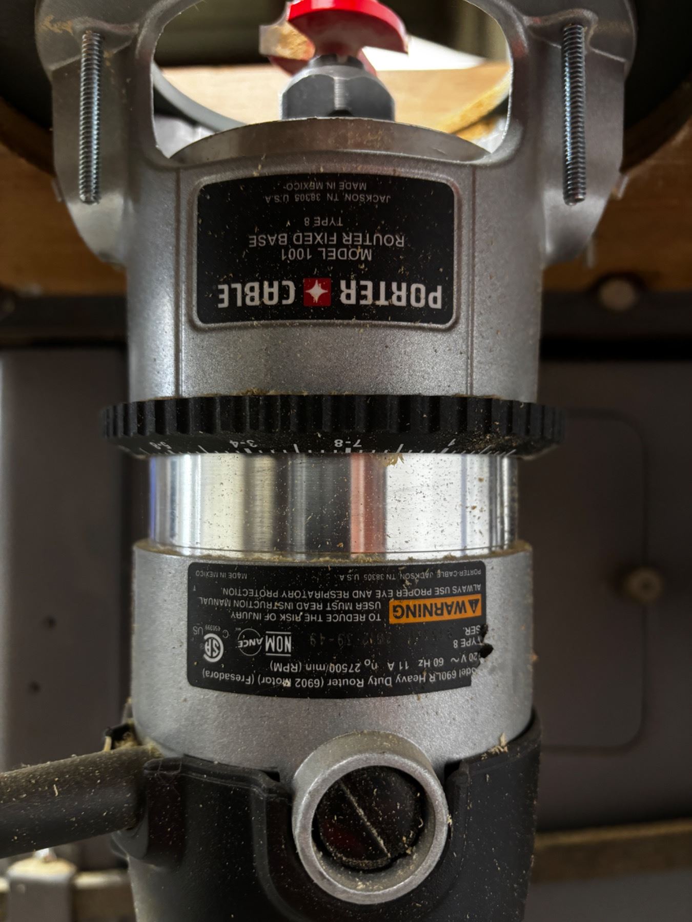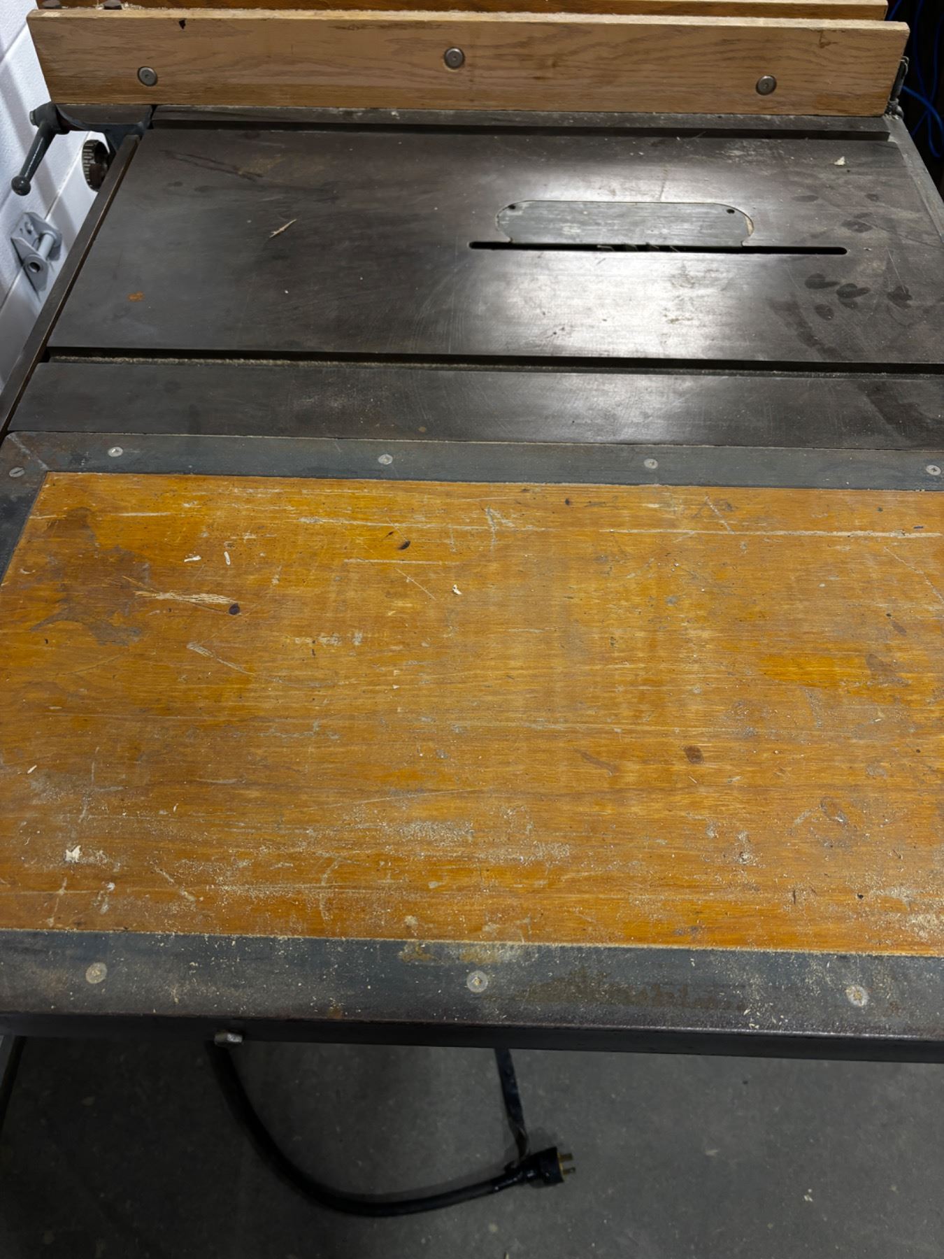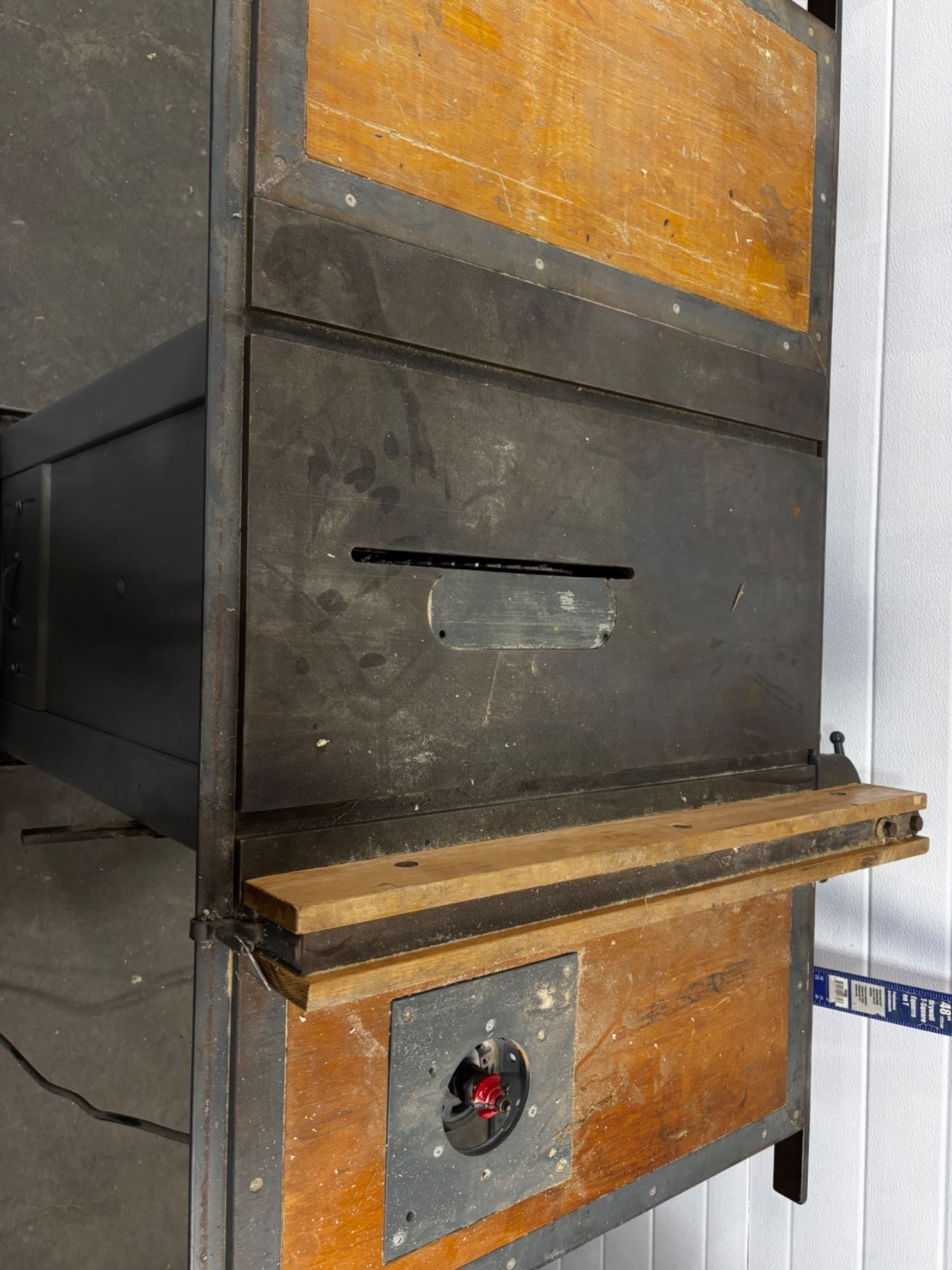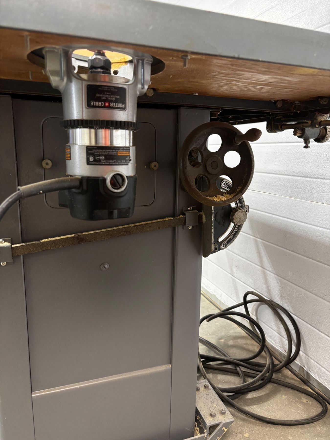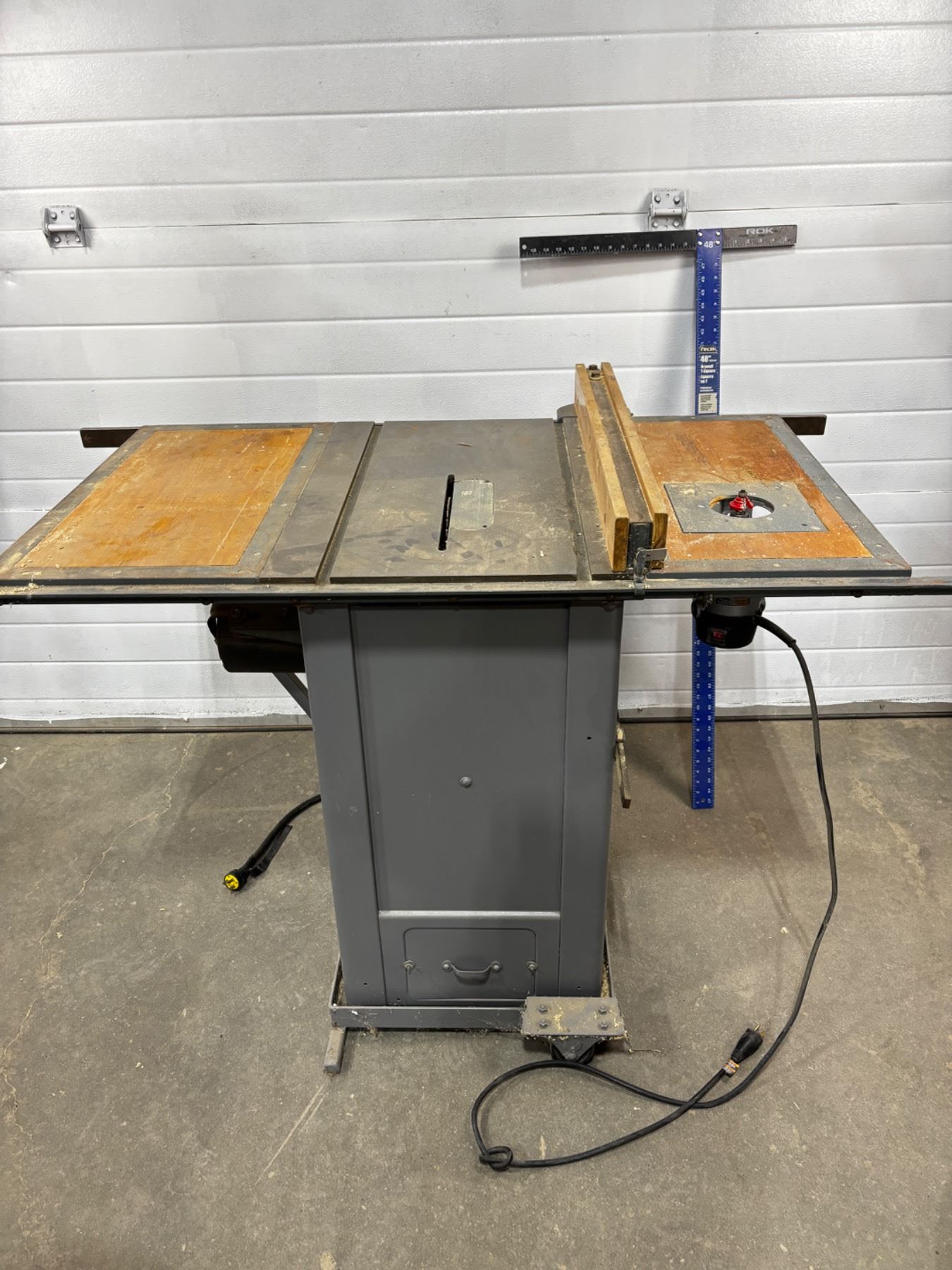 Router (Porter Cable Model 1001) was added to table at some point after purchase. Router tested and working saw not tested. Approximately 57" long by 36" wide and 40" tall. Router is standard 120V plug, saw table is 110V 6-15P plug. Includes 48" T-square.