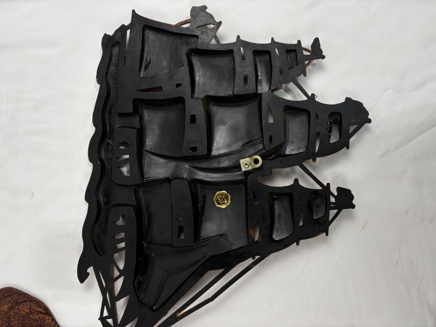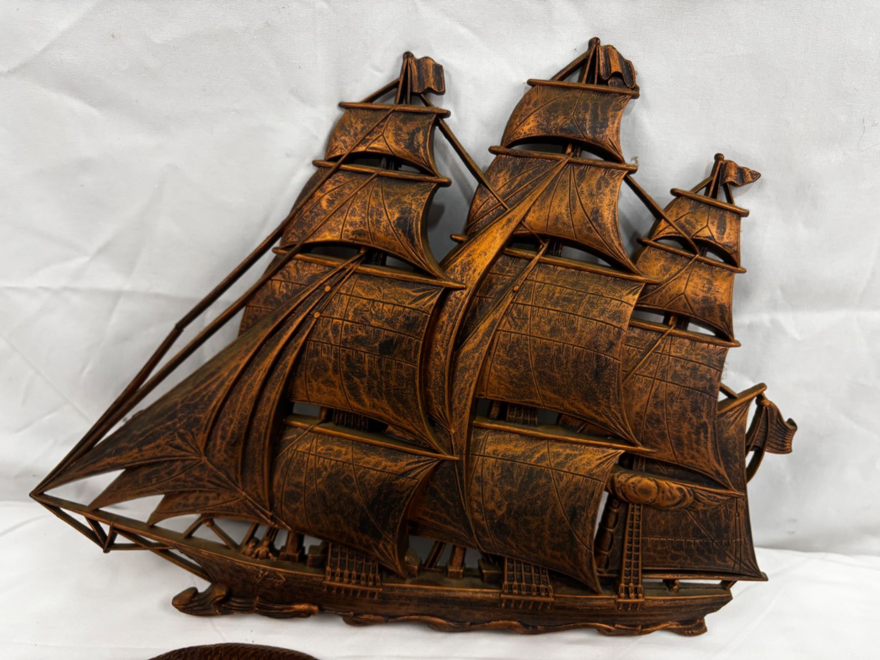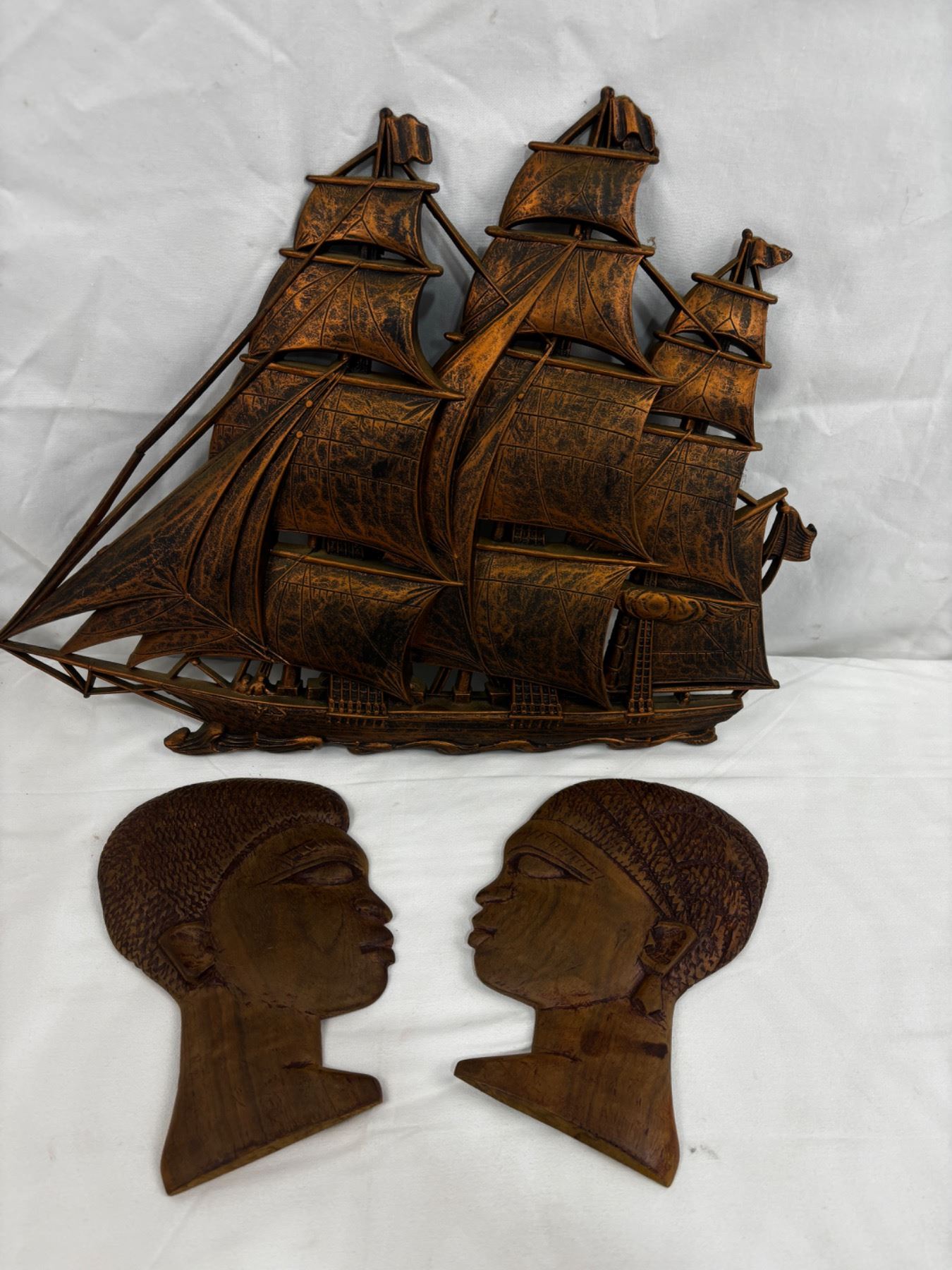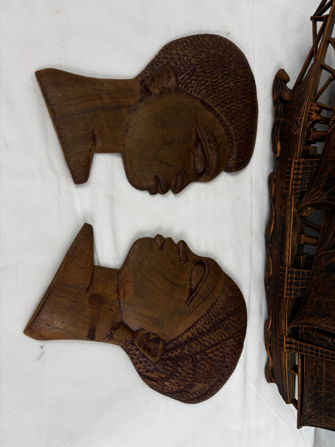 Includes, "Syroco" boat (has a crack) 16.5"L x 13"W, pair of wooden carved faces