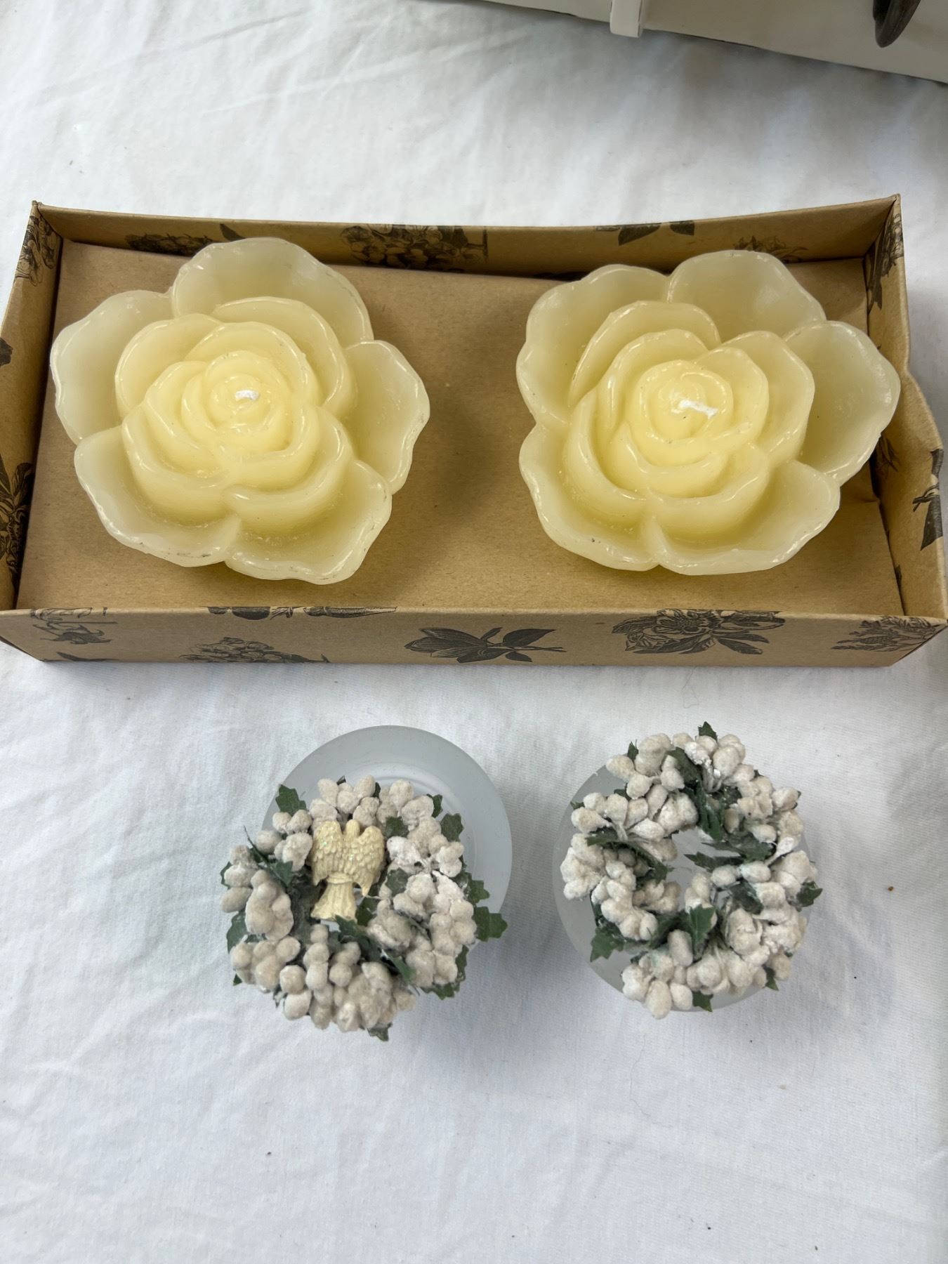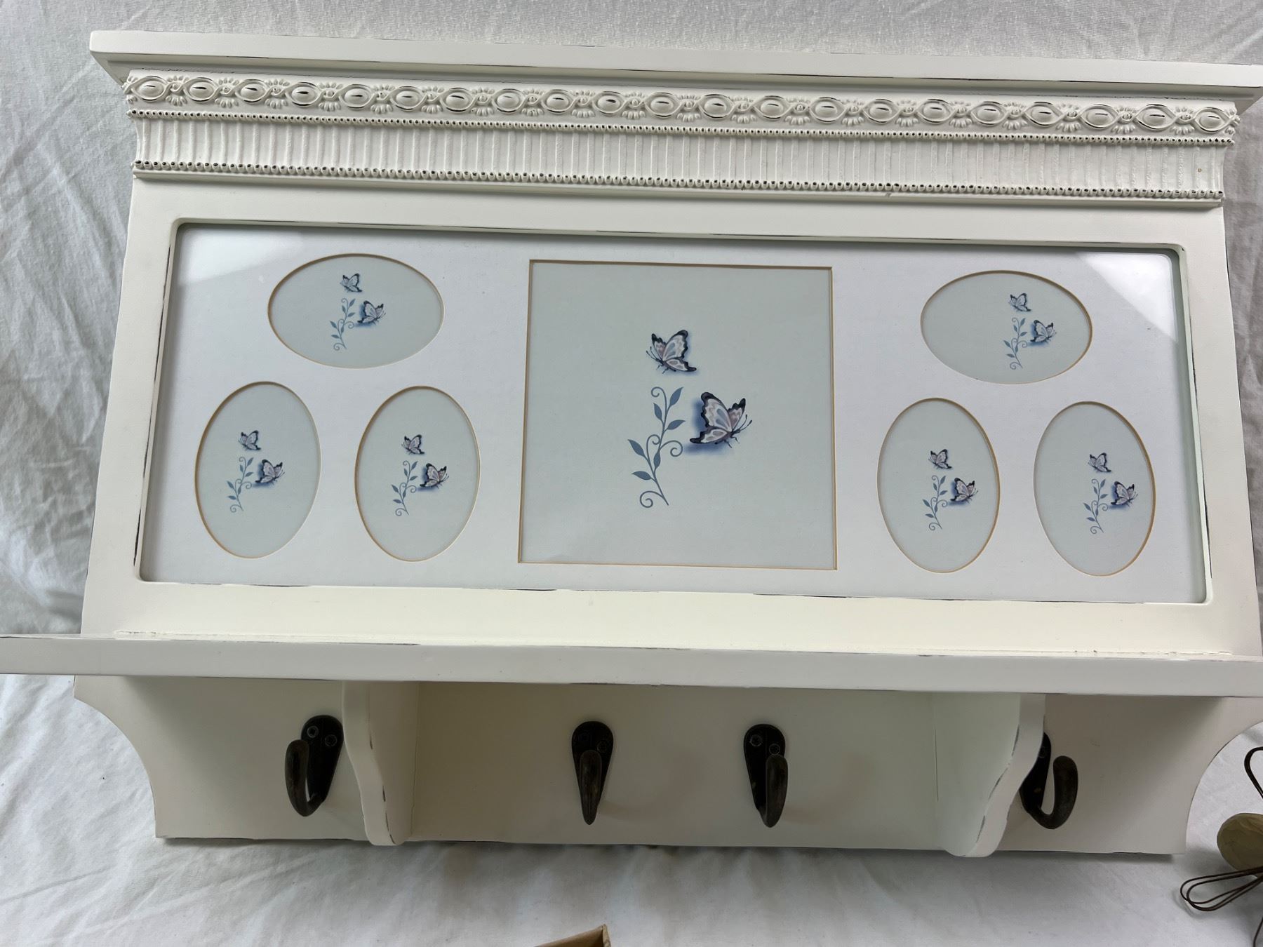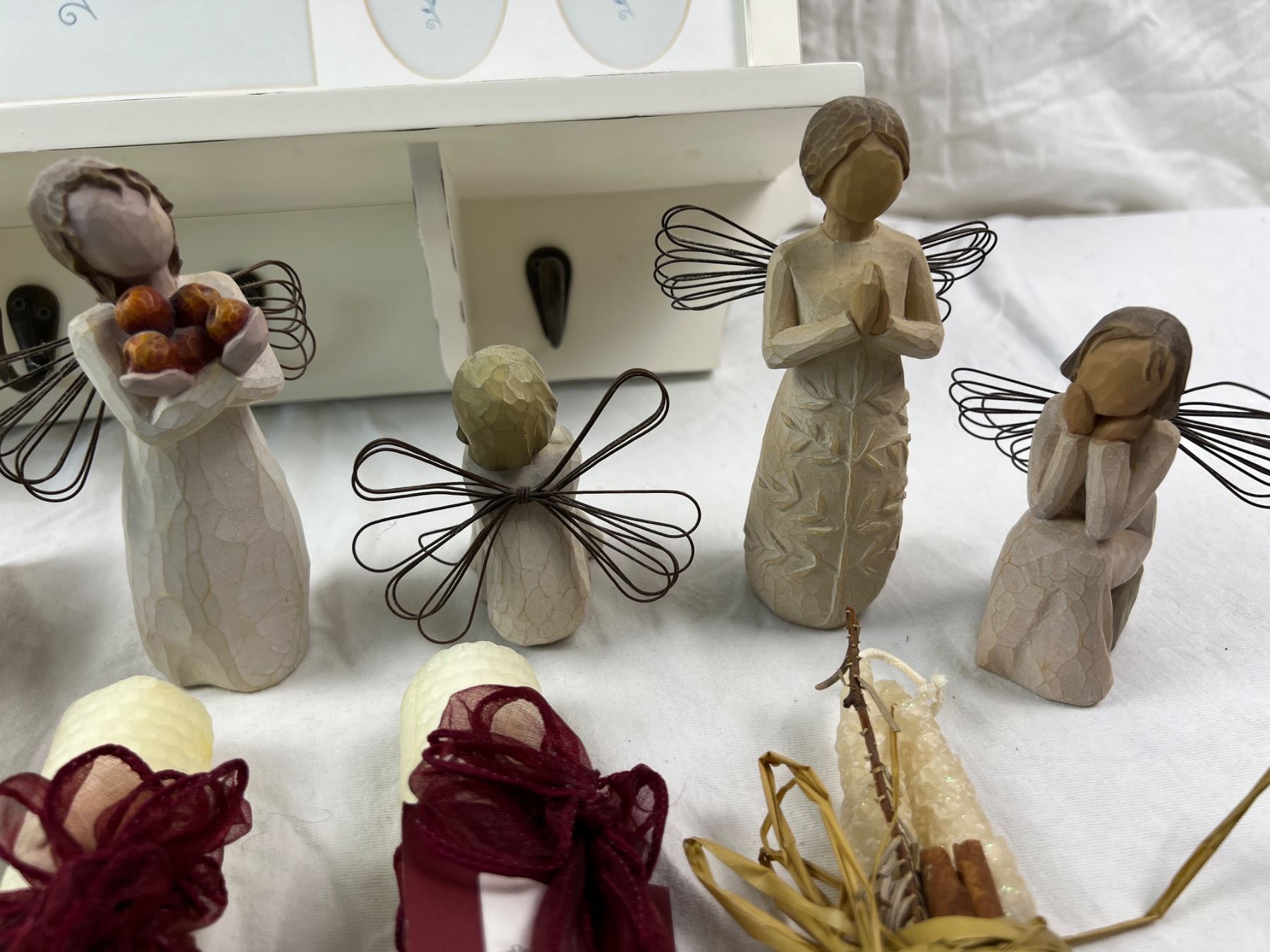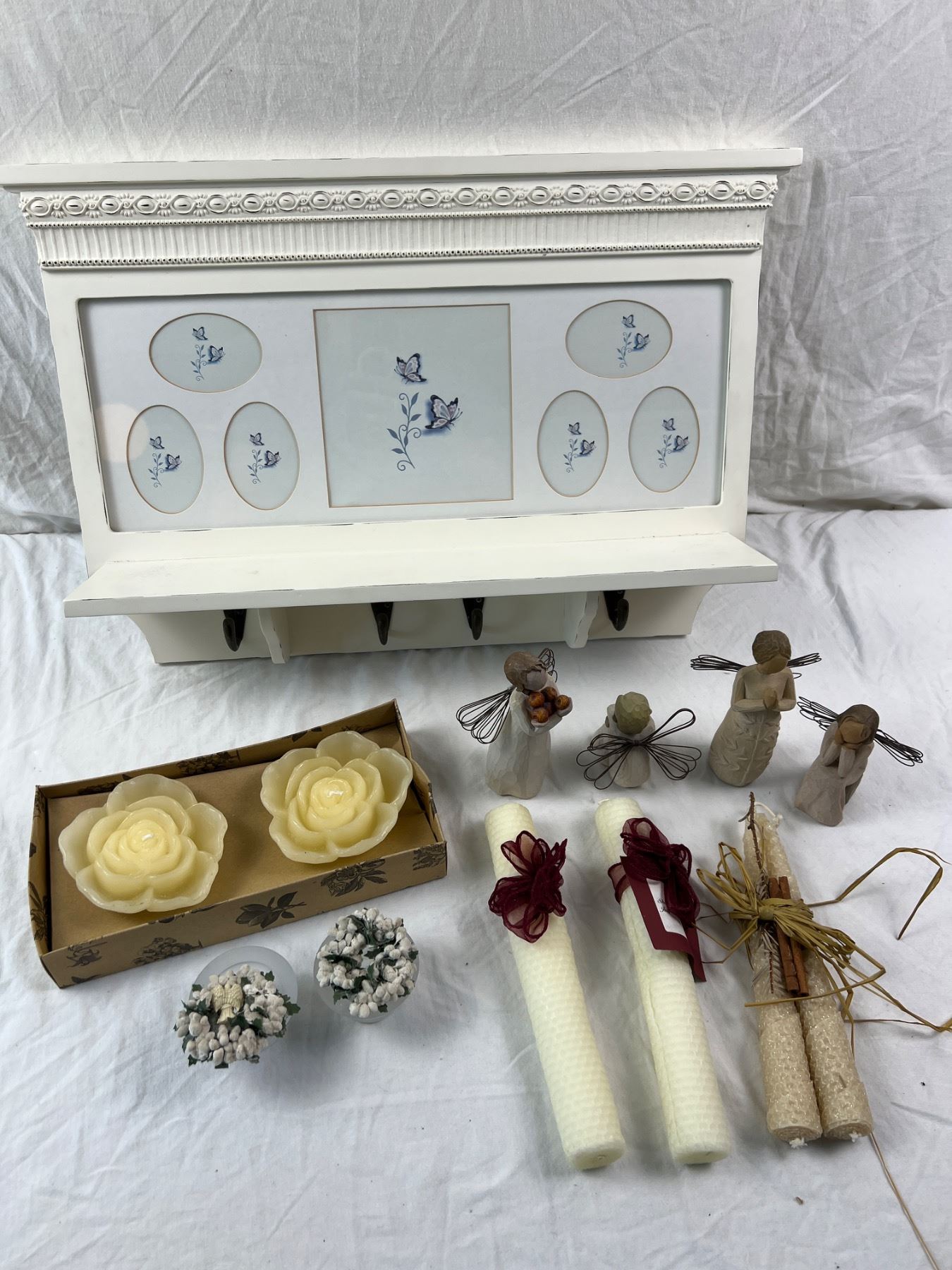 The wall shelf is 20"L x 14"H, includes four Willow Tree figures, candles, and more