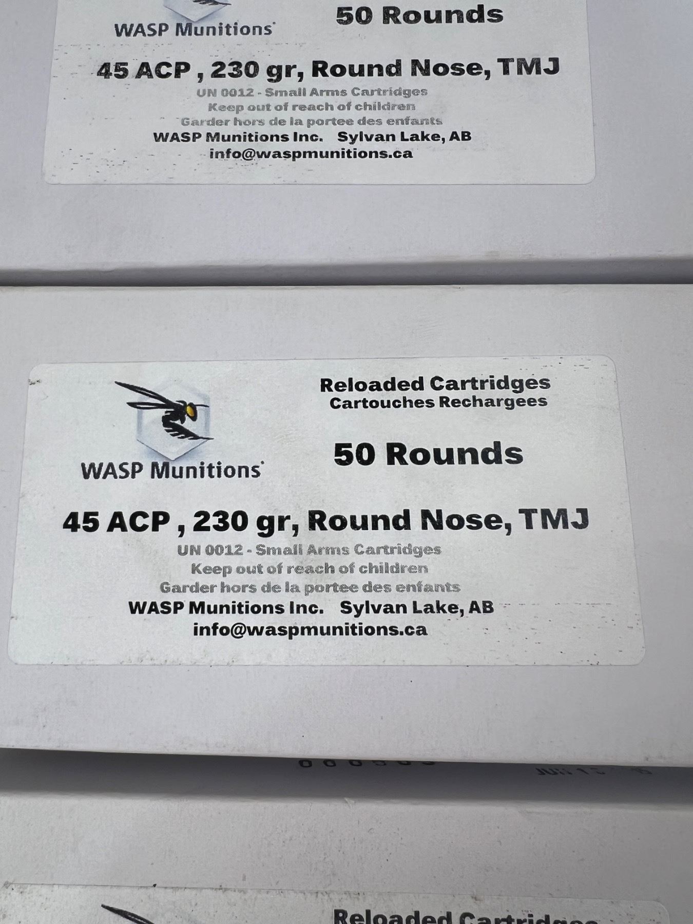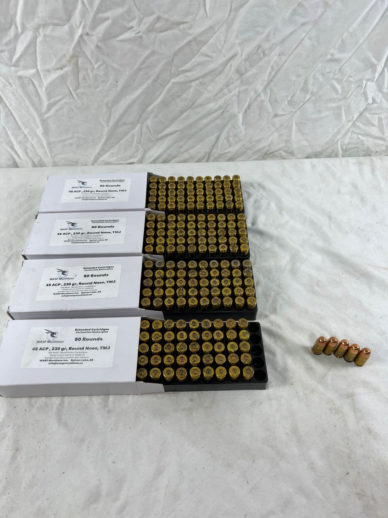 4 boxes of 50 for 200 rounds total. 230 Grain TMJ. **Reloaded Rounds**