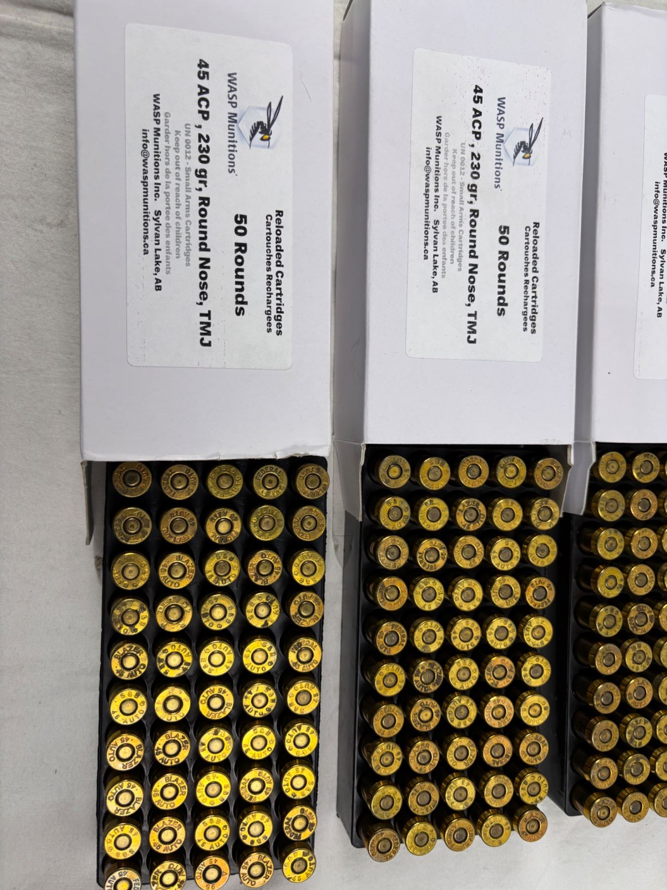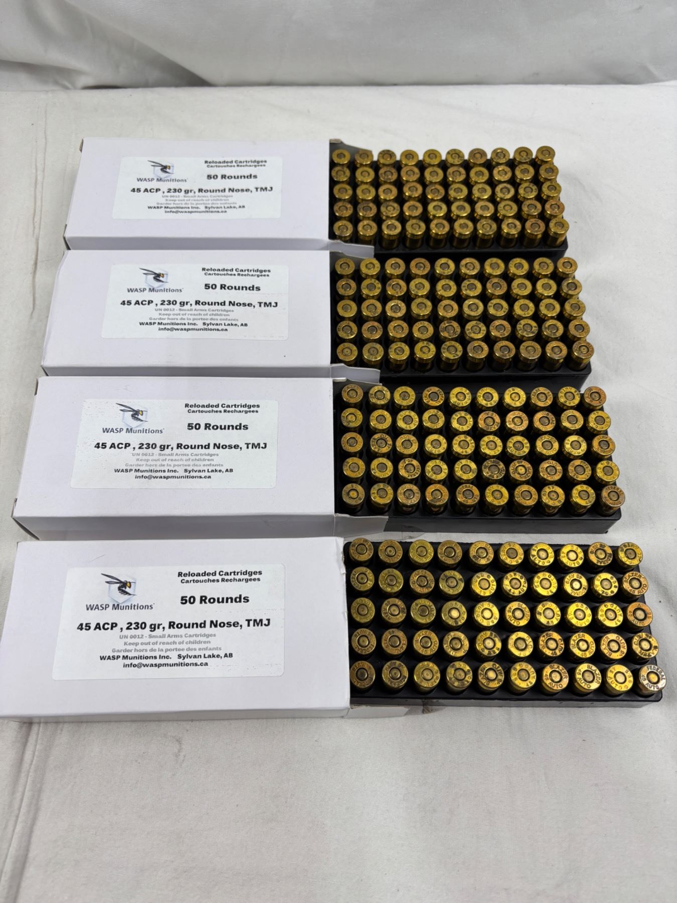 Includes four full boxes of 50 rounds, 45 ACP 230Gr Round Nose TMJ
