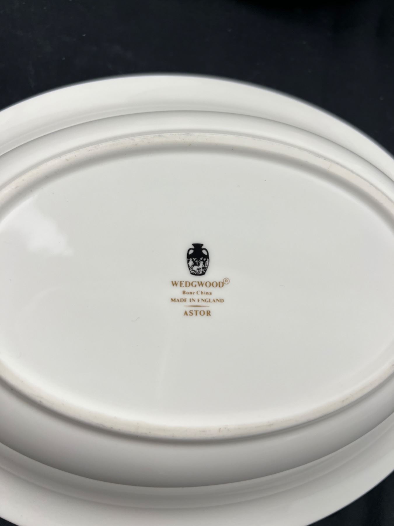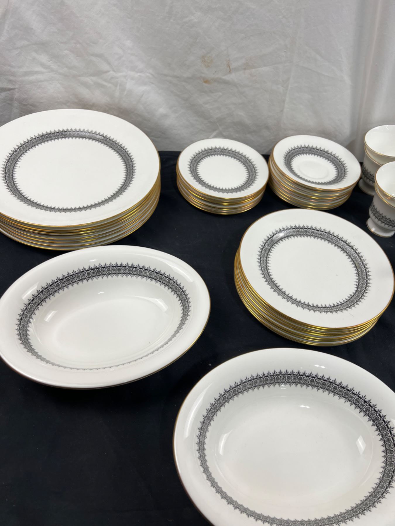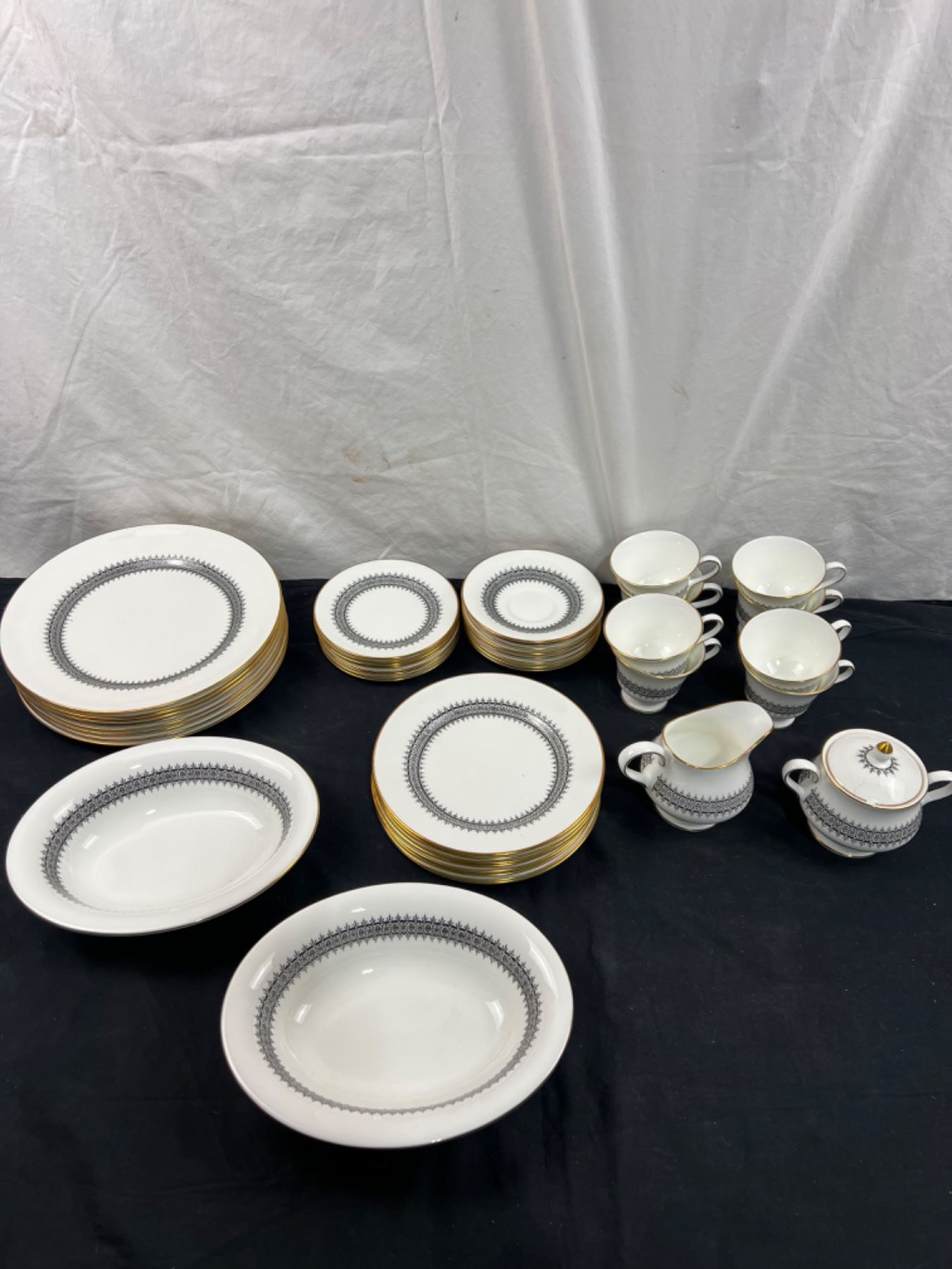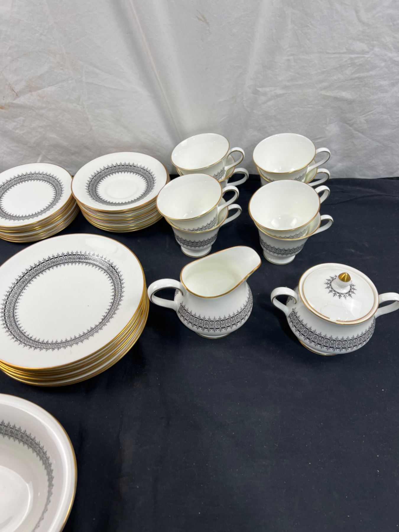 Includes 8 Dinner Plates, 8 Dessert Plates, 8 Cups & Saucers, 2 Serving Bowls, 8 Side Plates & Cram & Sugar Pots