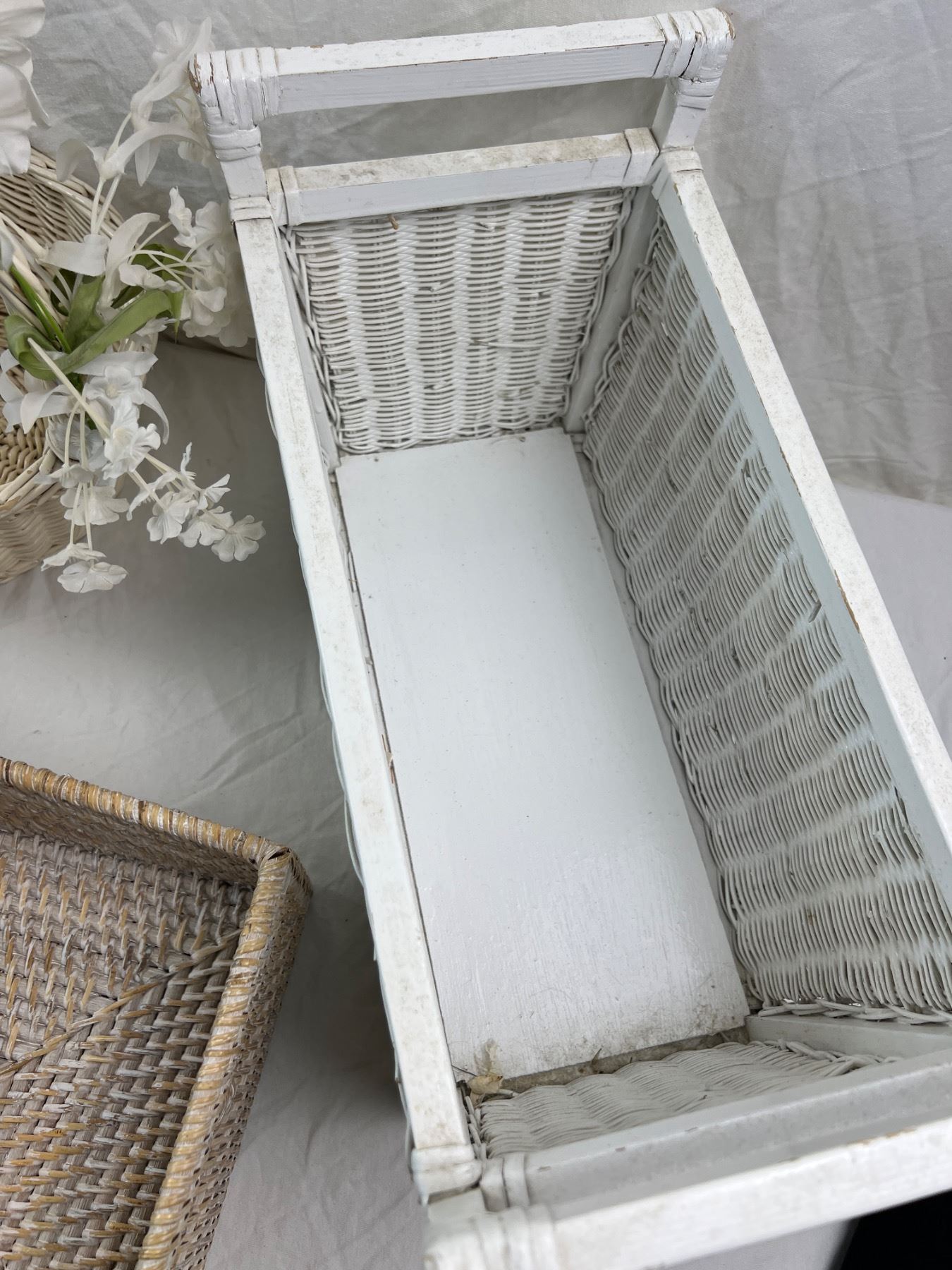 The largest tray is 16"L x 12"W x 6"H, some ends are frayed on the bigger baskets