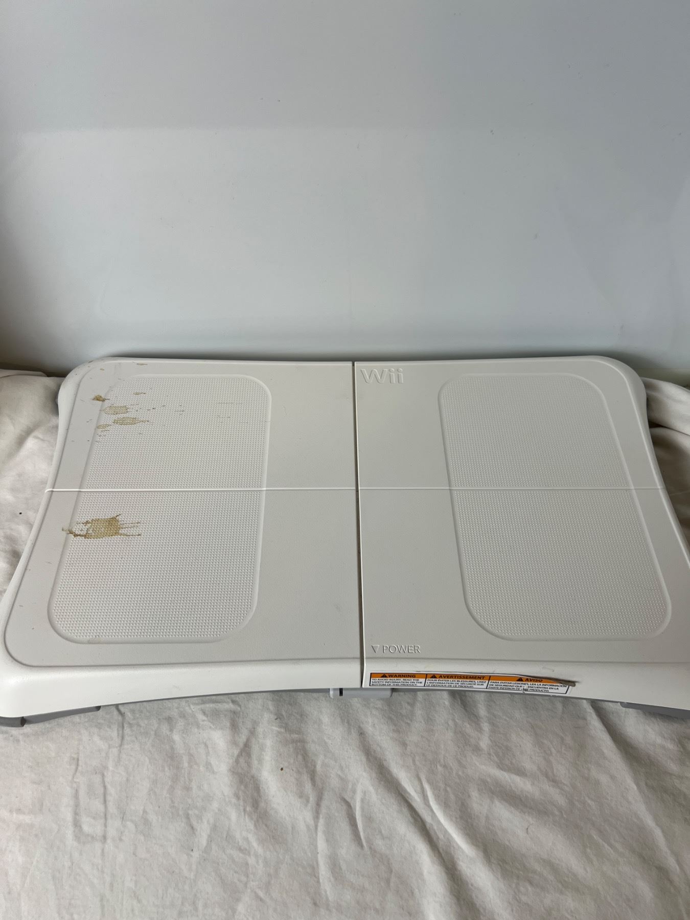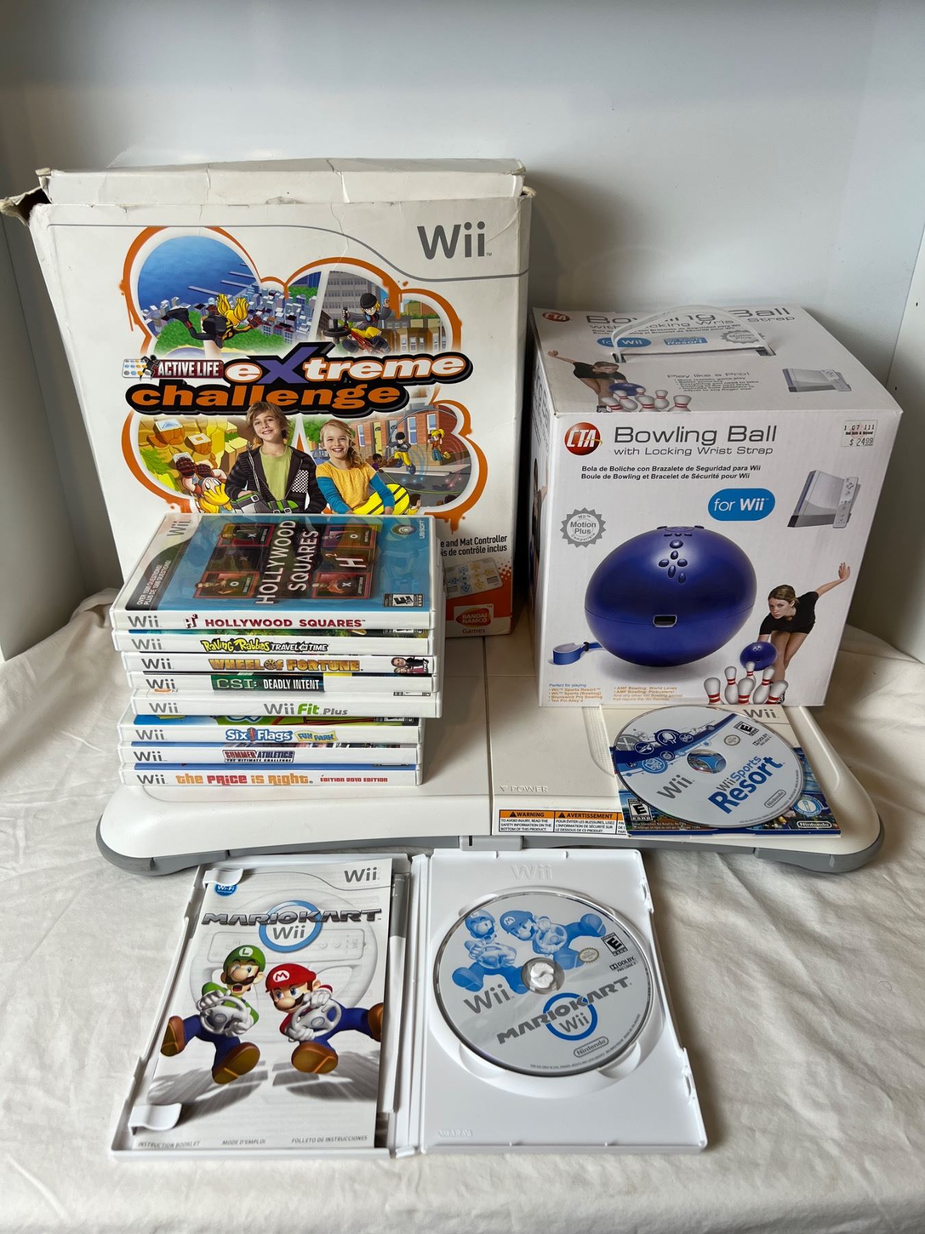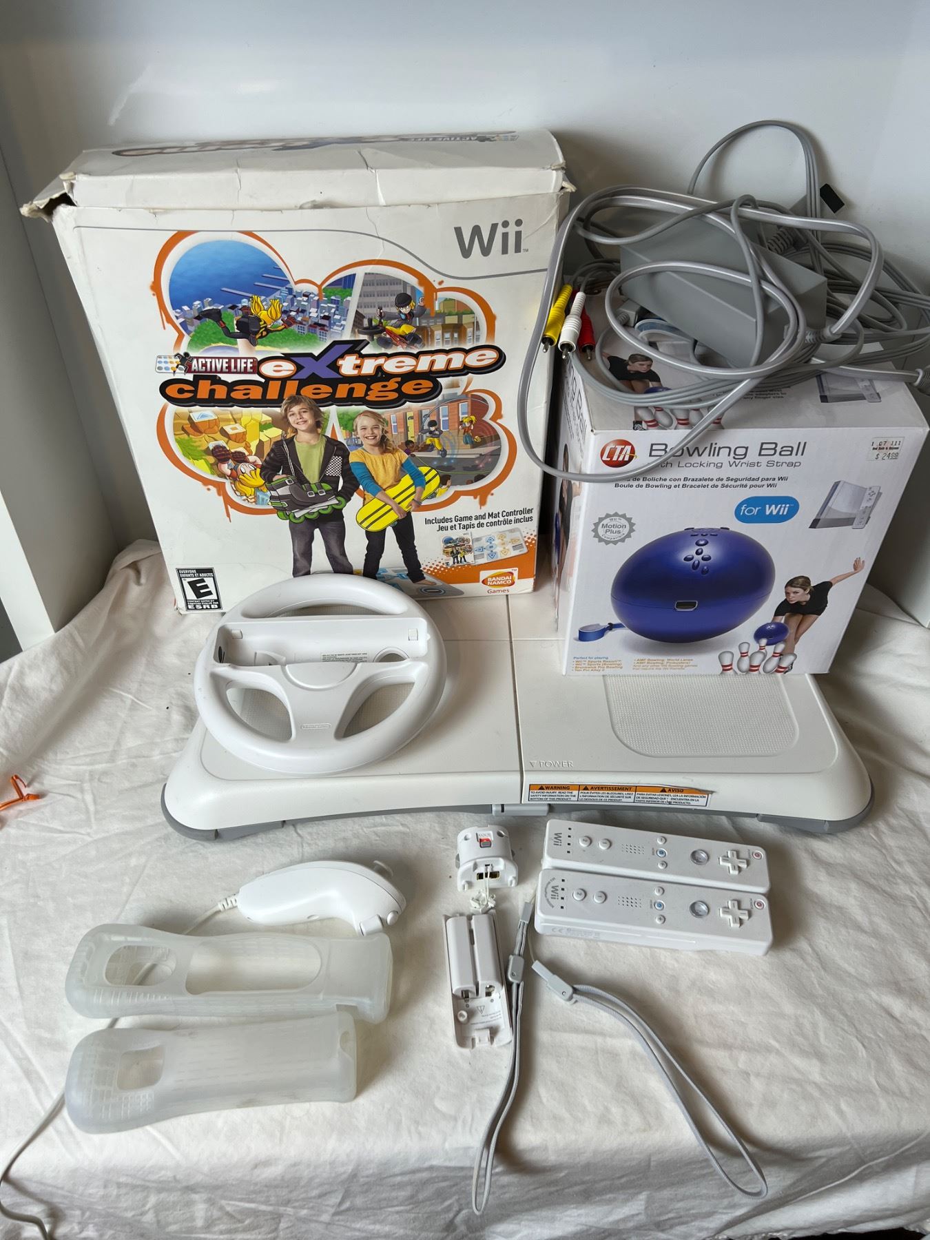 Includes multiple games, fitness pad, extreme challenge, and a Wii bowling ball which is brand new in a box. Unknown if pad works. Stain on pad.