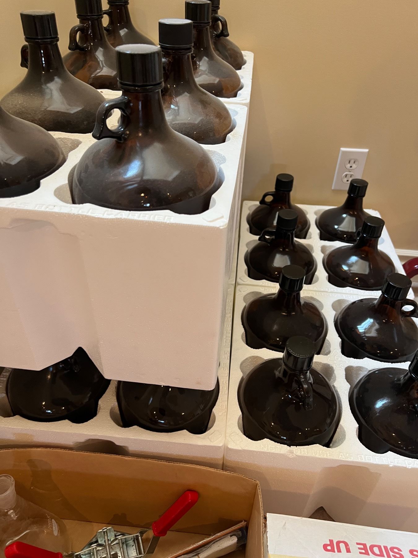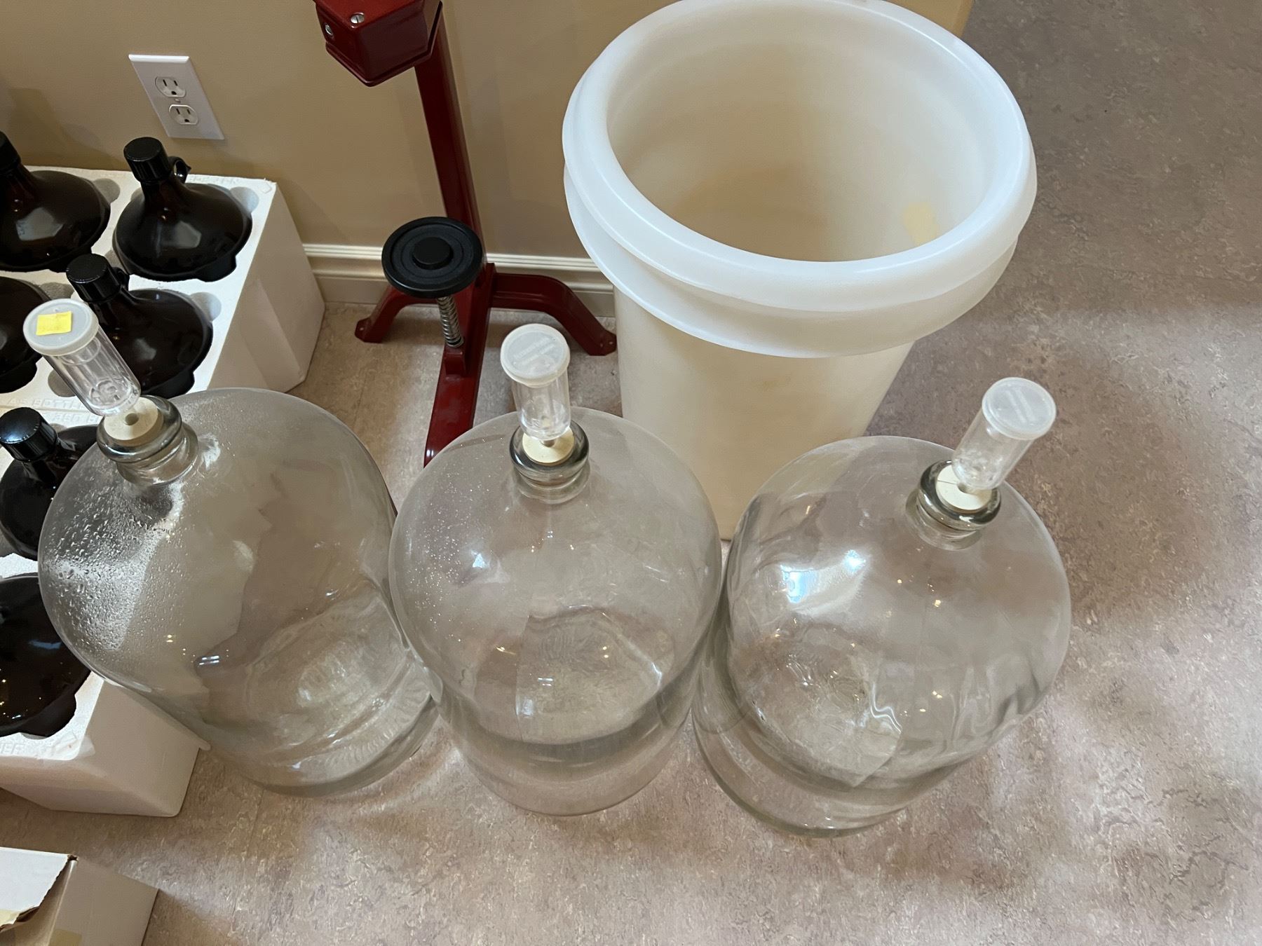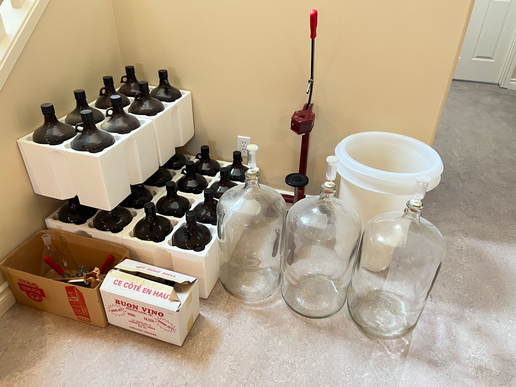 Includes a bottle corker, various glass jugs and bottles, amber glass bottles are 13.5"H, and more