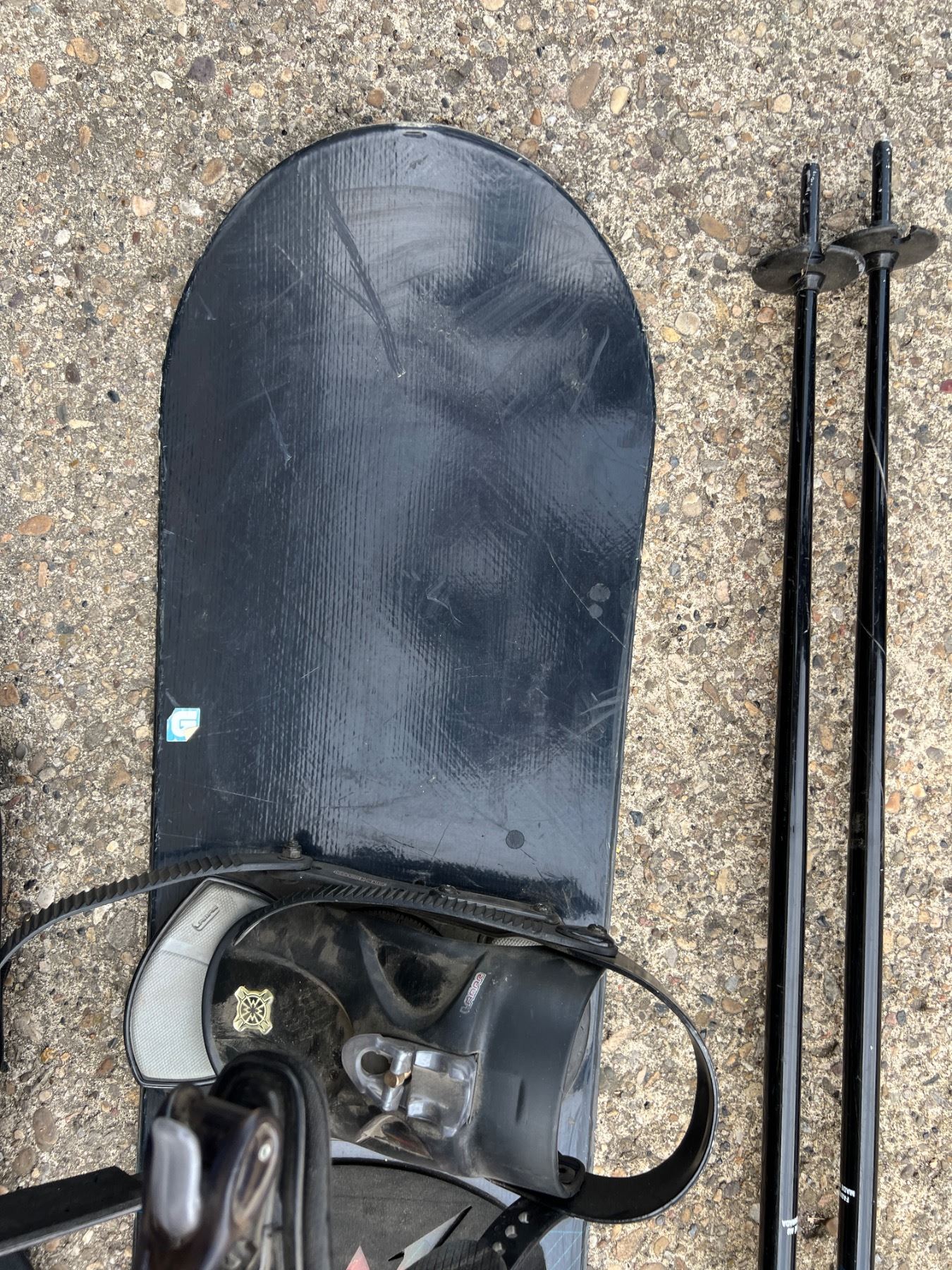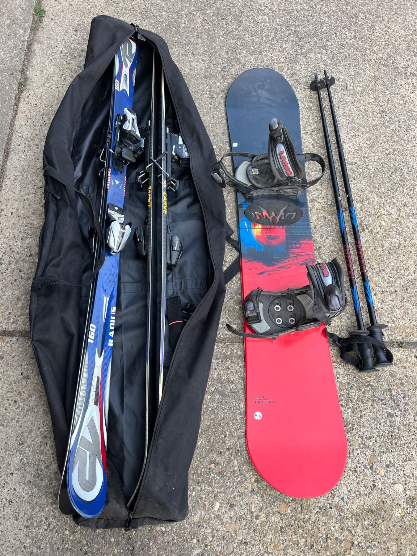 Includes, Equipe Poles, Vision Aurora 148 snowboard, two sets of skis, and more