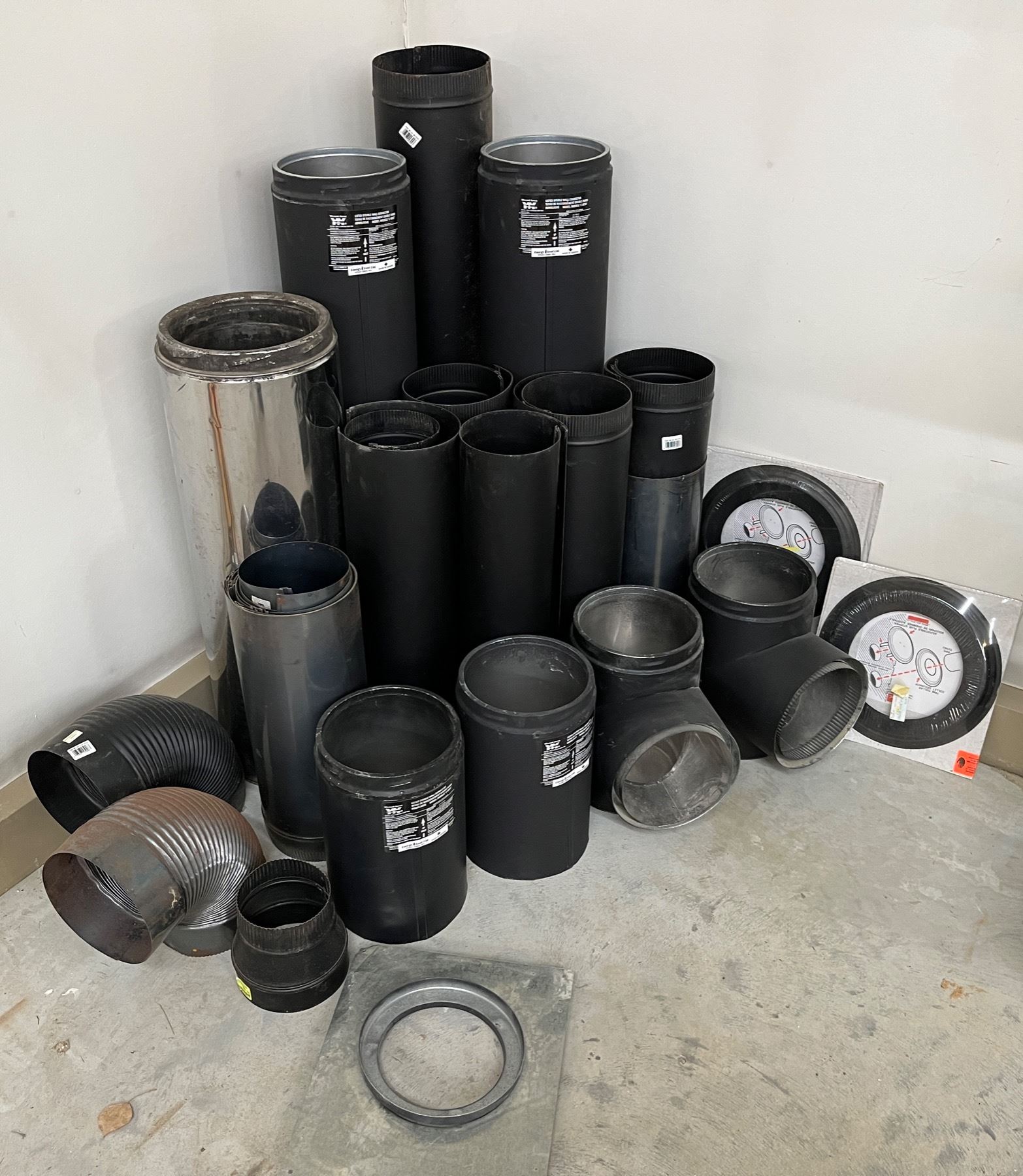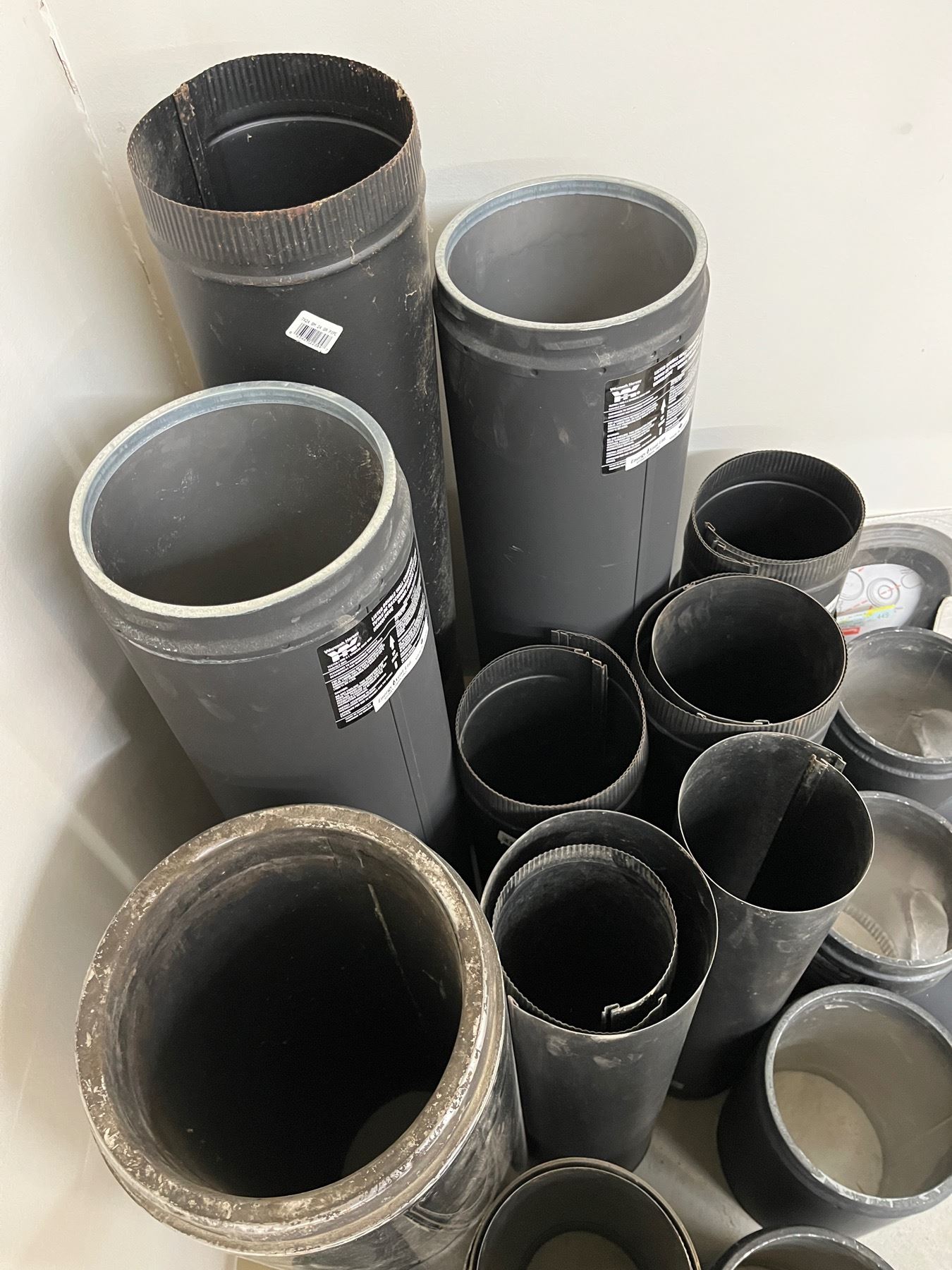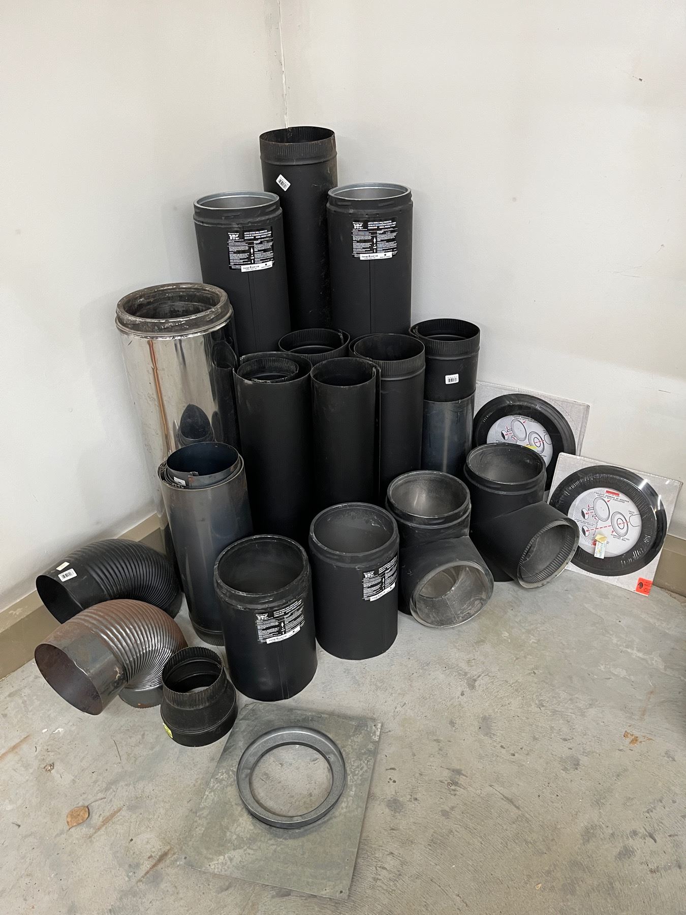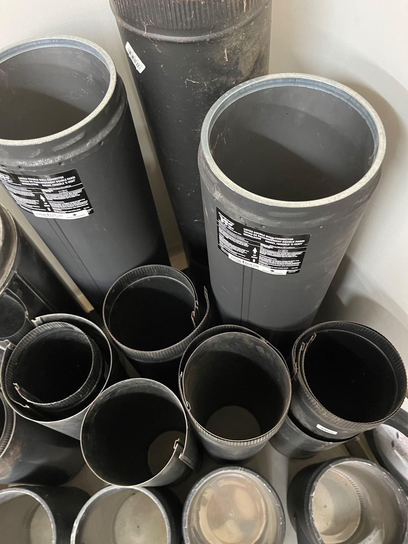 Includes double wall connector insultated, chimney rings, seam lock pipes etc… All 6" except 1 silver pipe