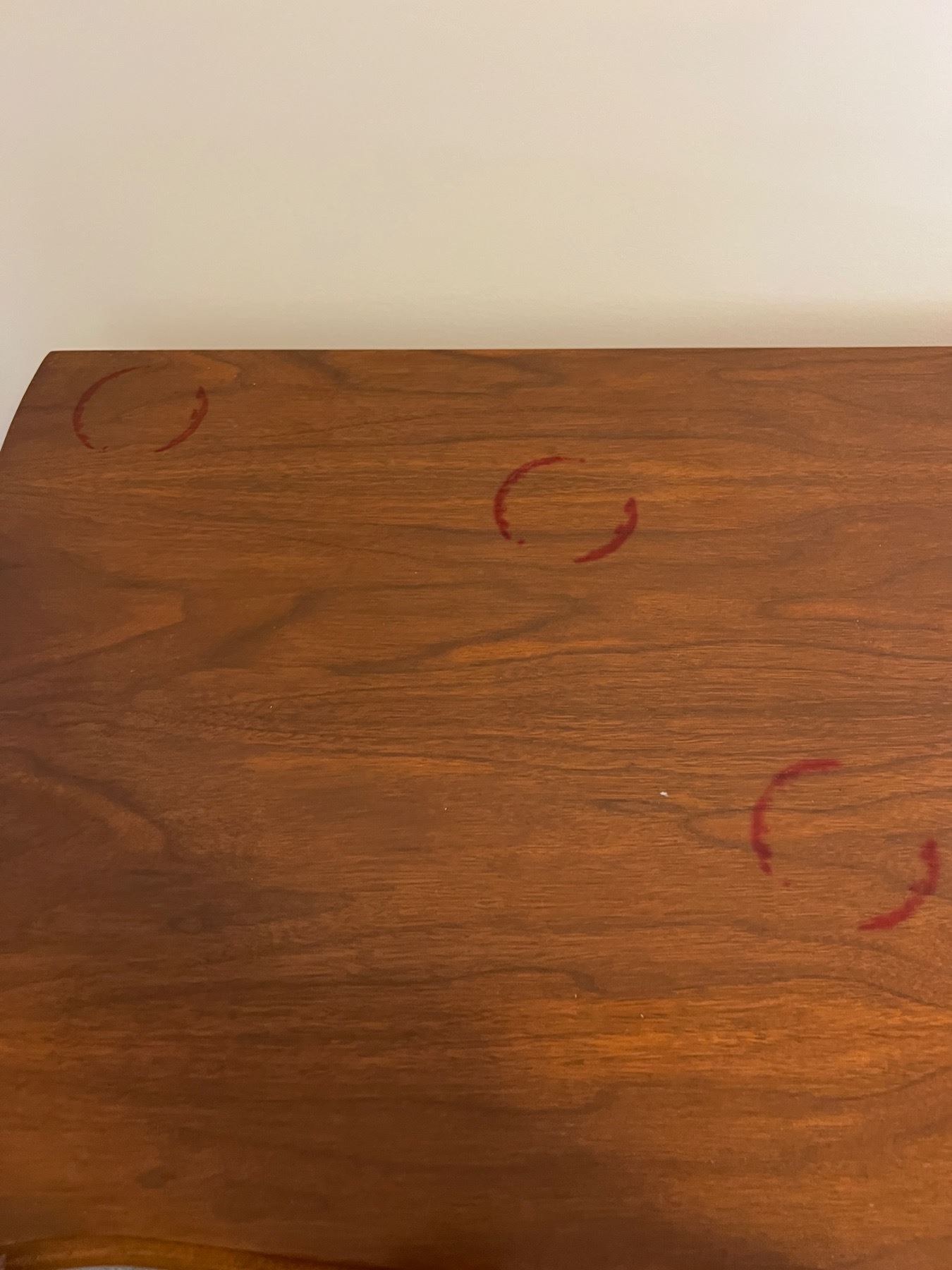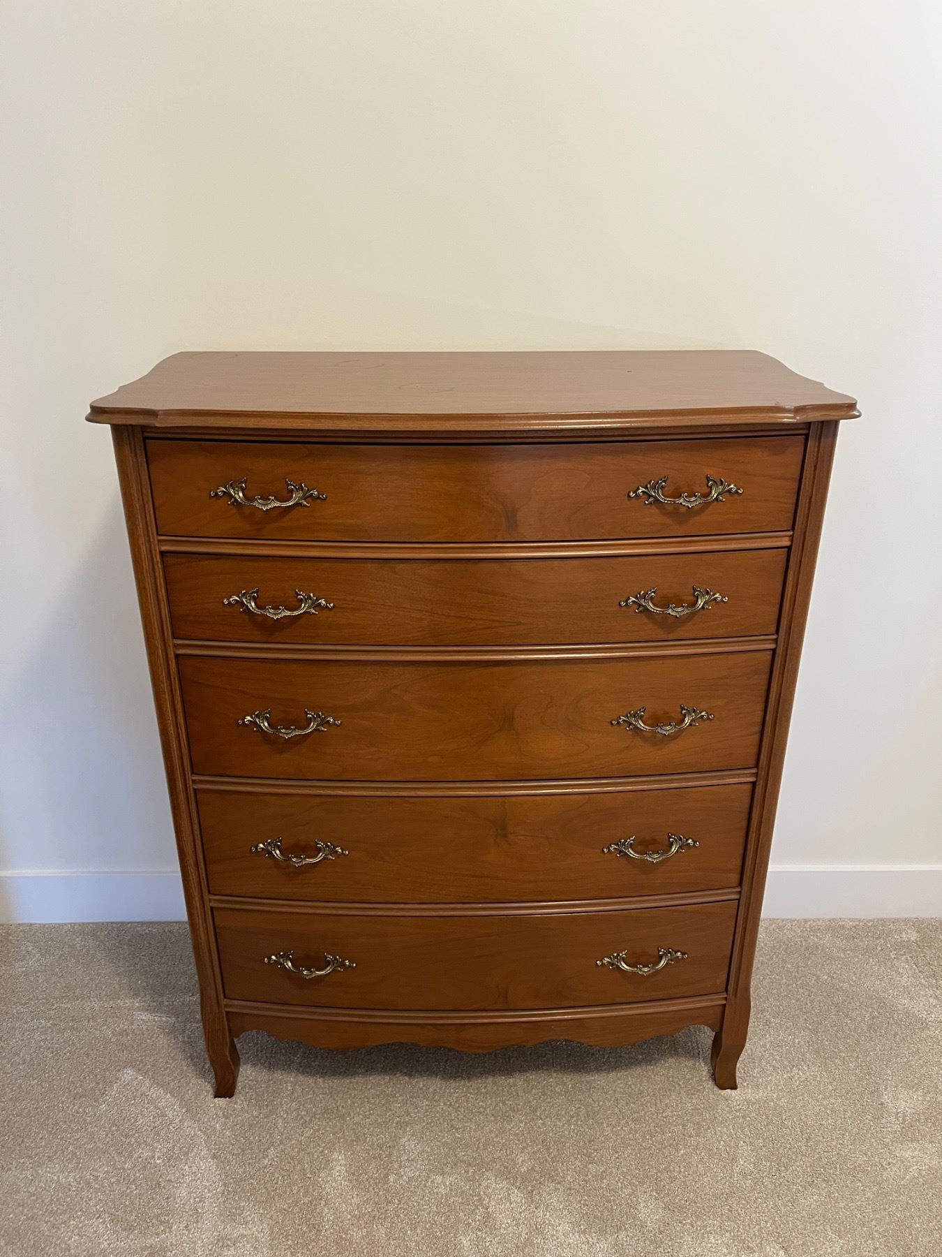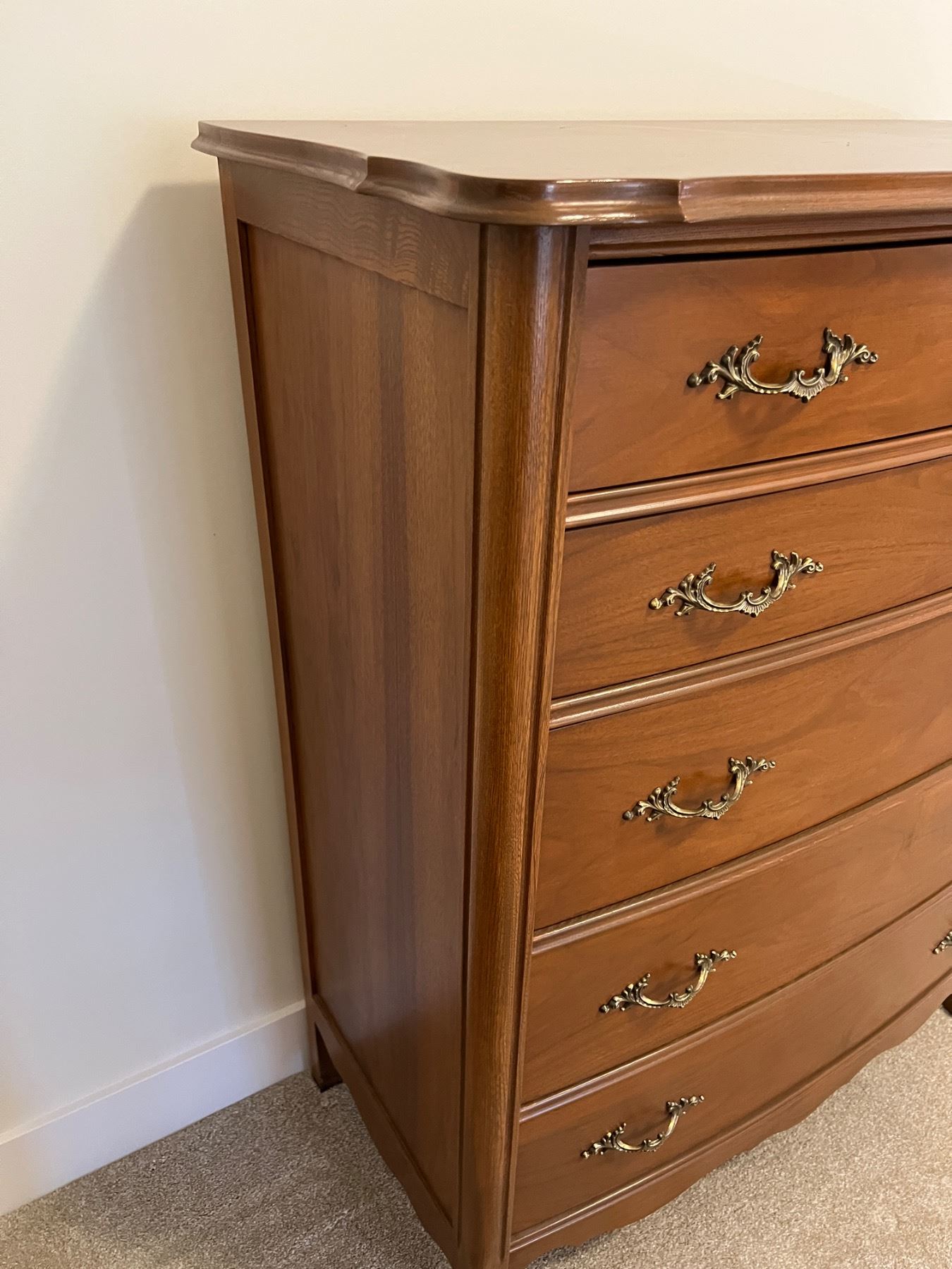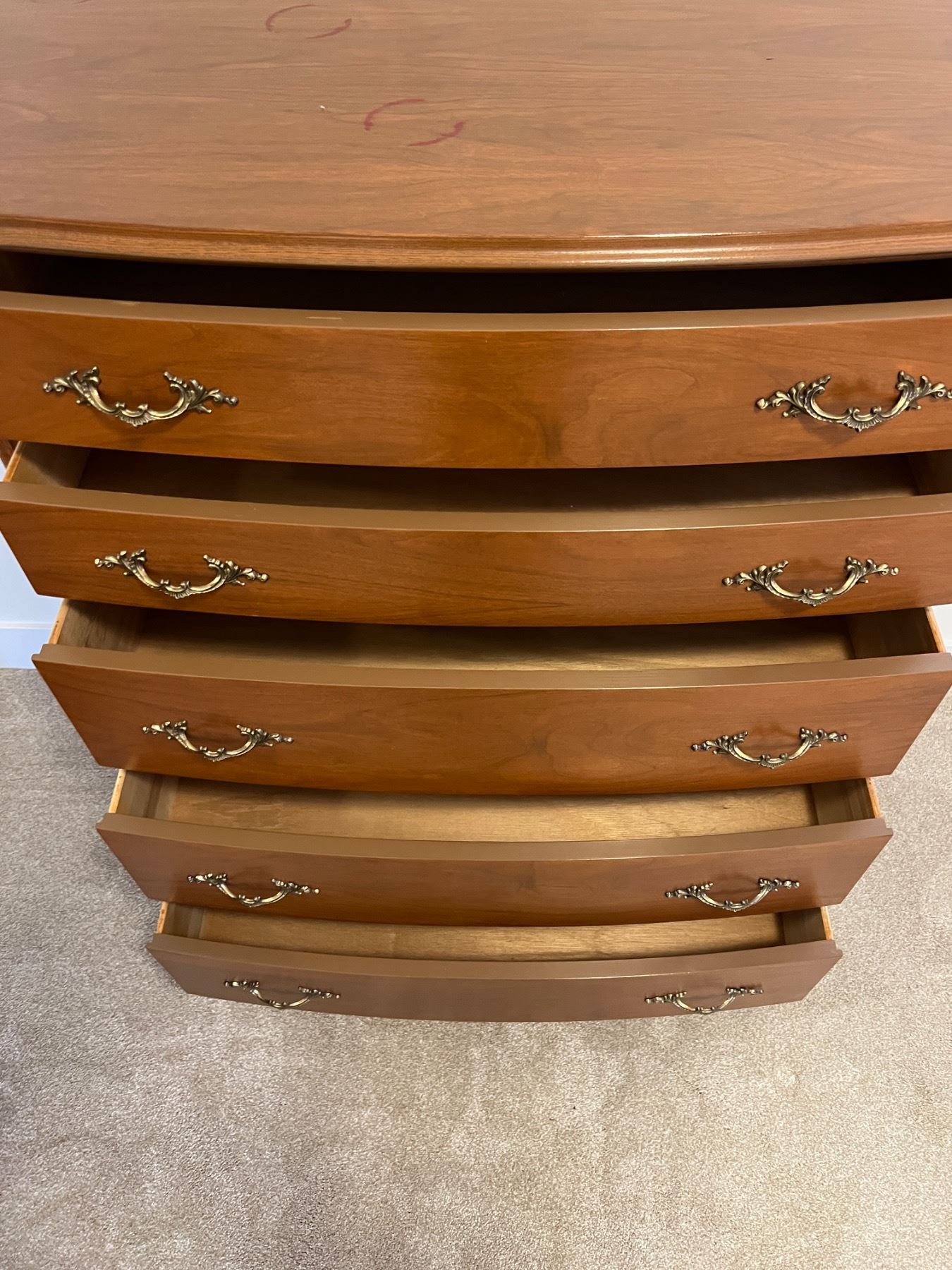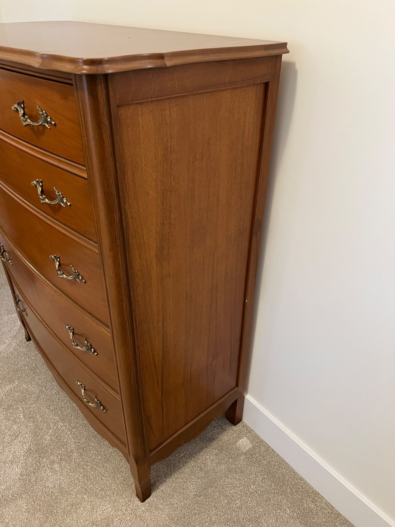 37"L x 19"W x 47"H, has some candlewax stains on the top, five drawers