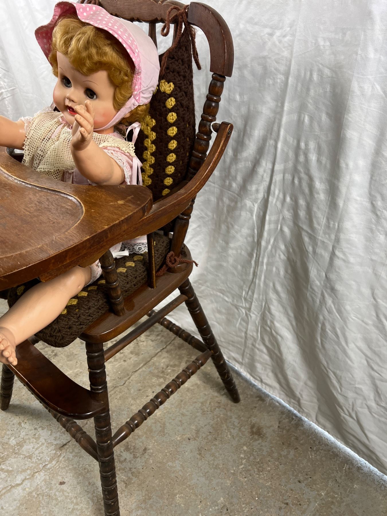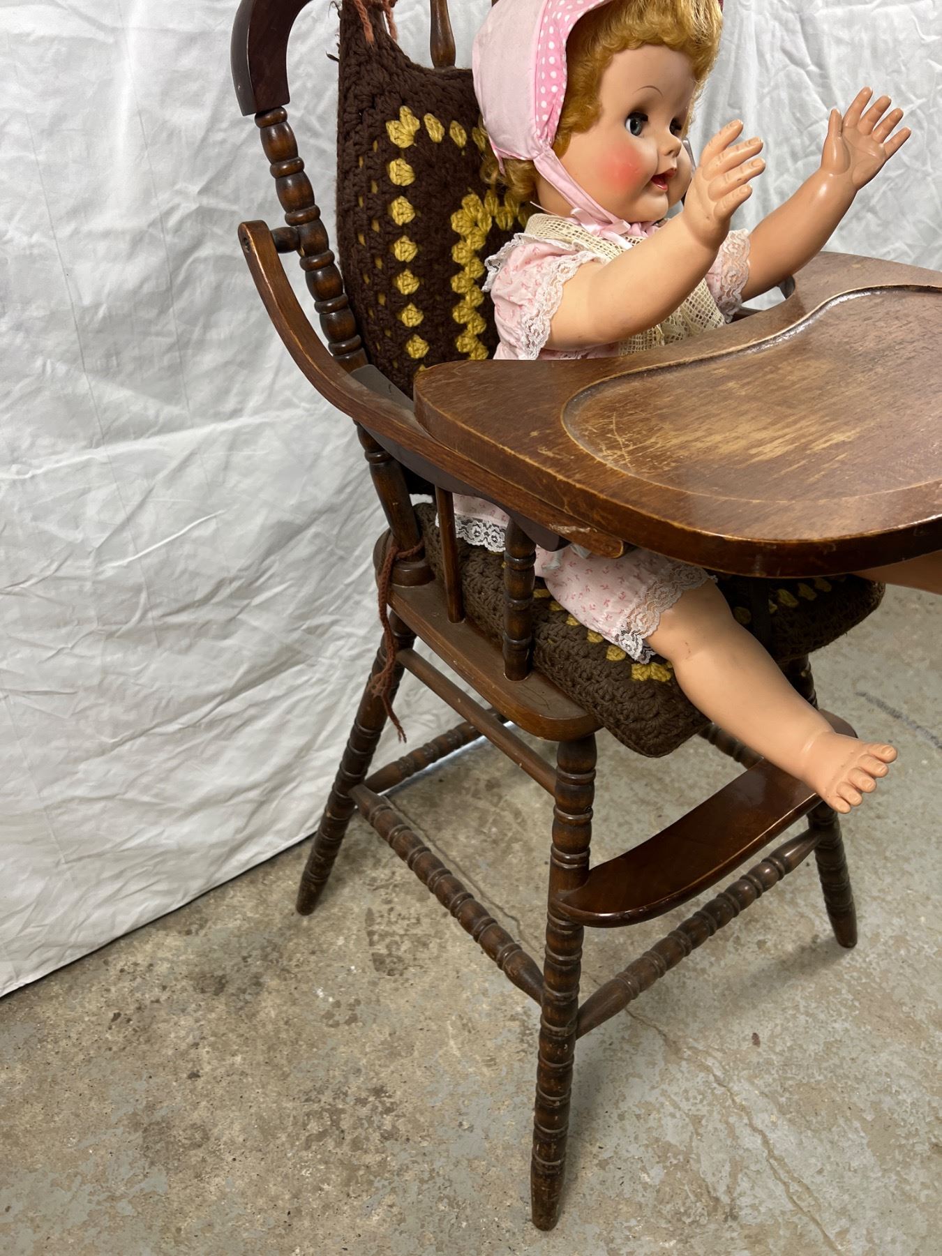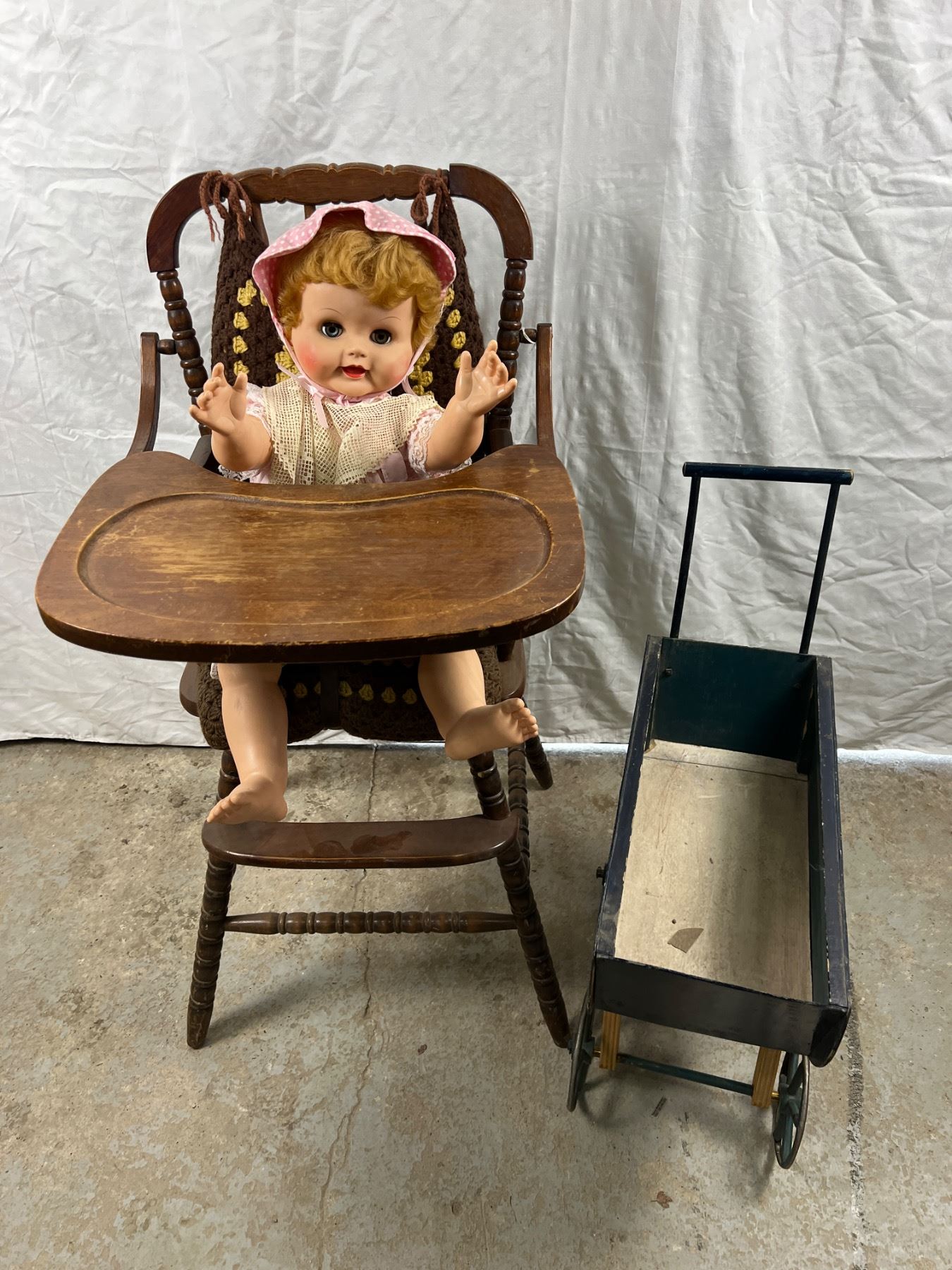 Some wear and tear, the high chair is 20"L x 19"W x 40"H, the stroller is 21"L x 9"W x 27"H