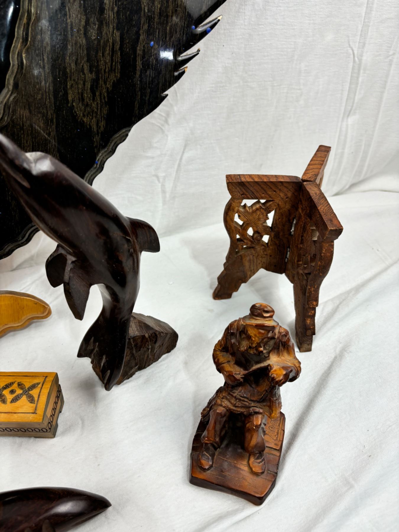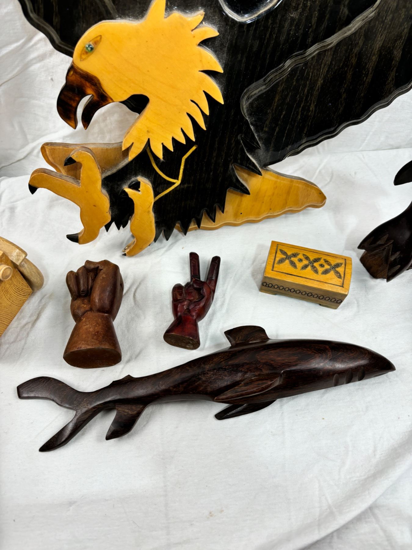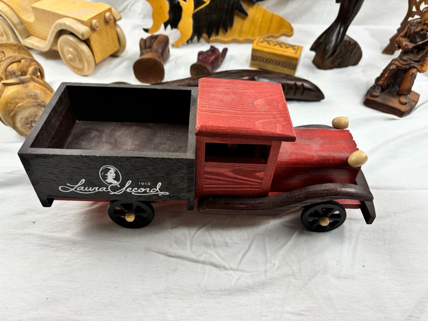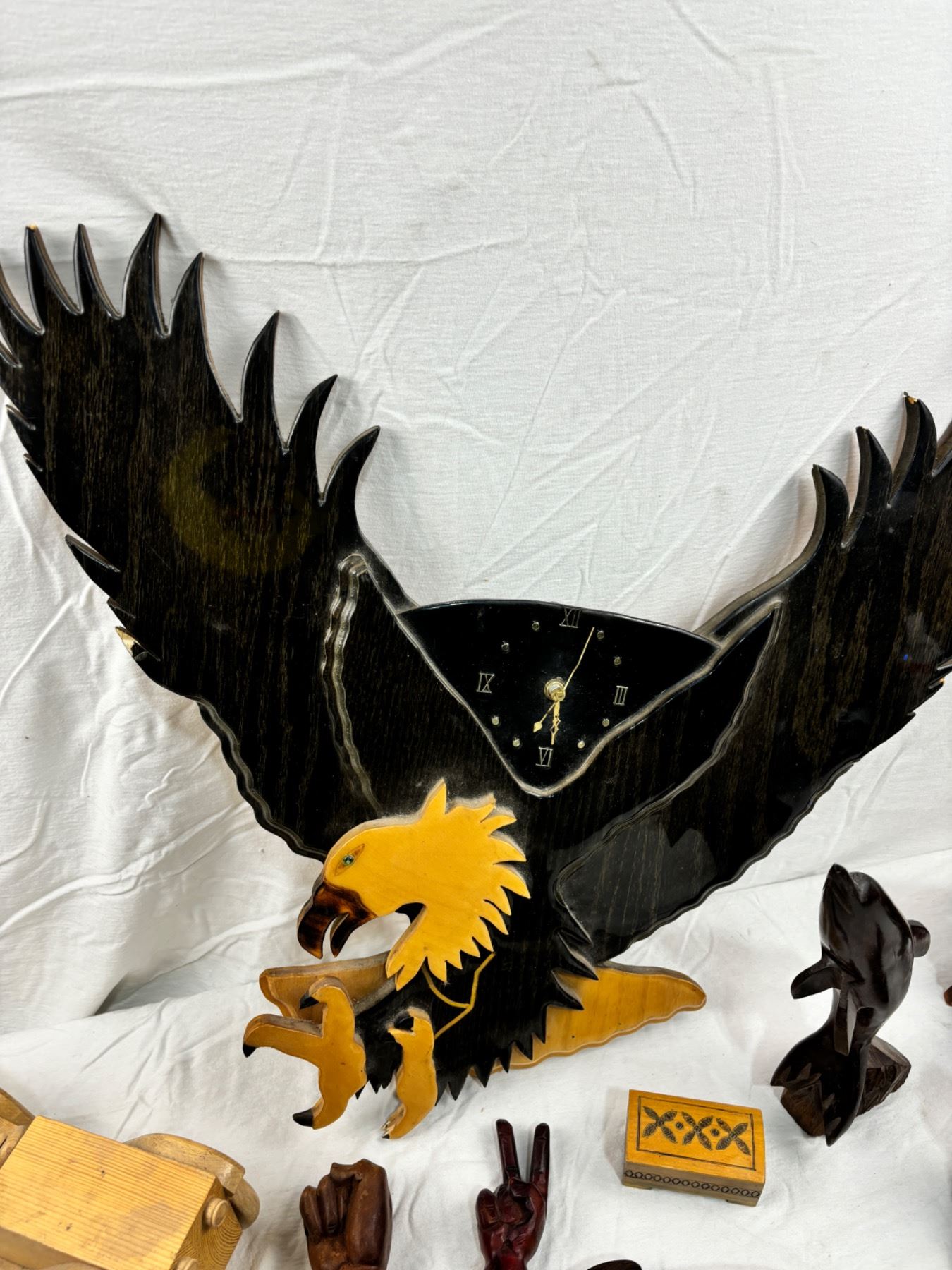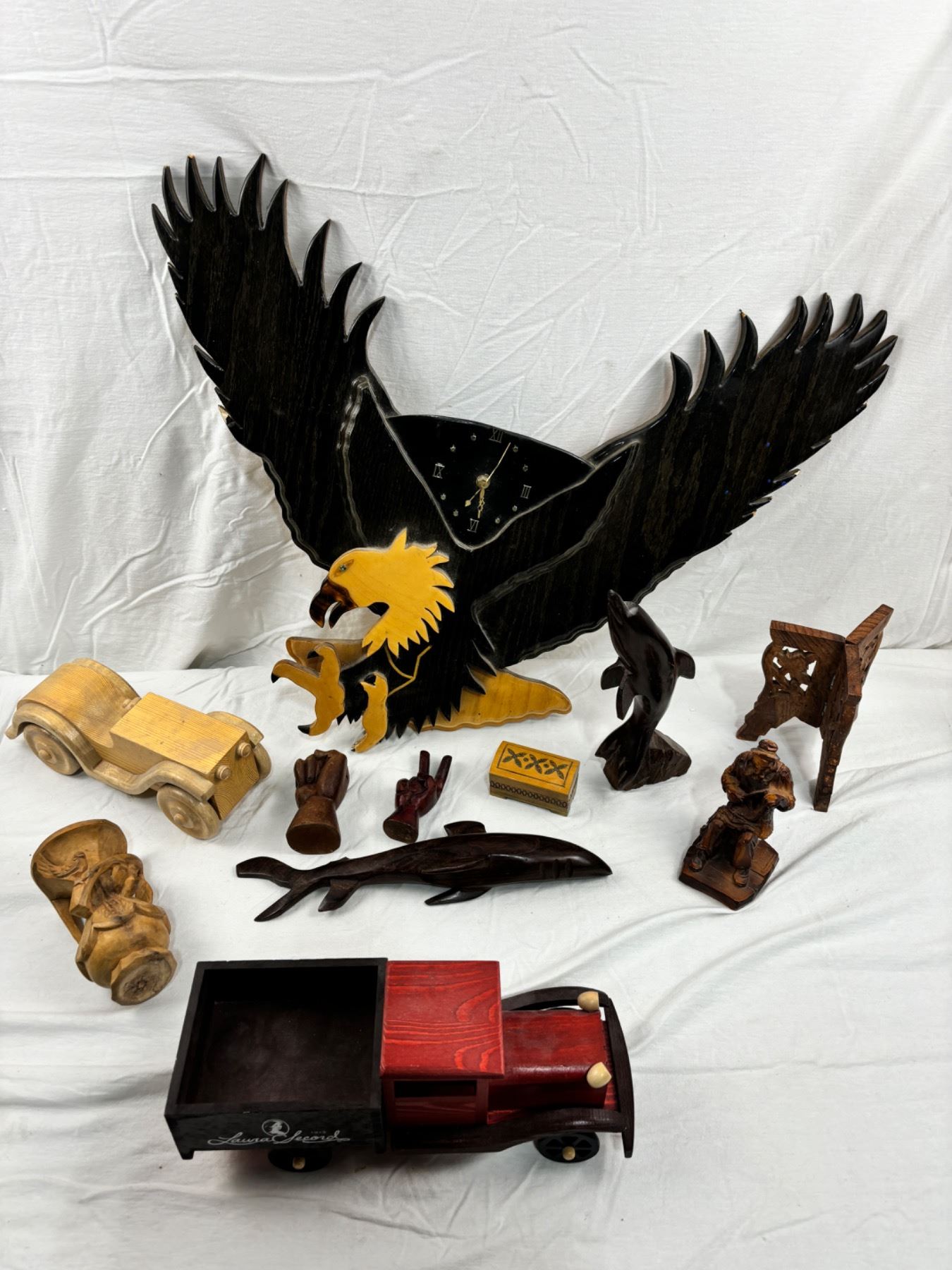 Includes an Eagle Clock (has a chip) 25.5"L x 22"H, Laura Second wooden truck, trinket box, etc.