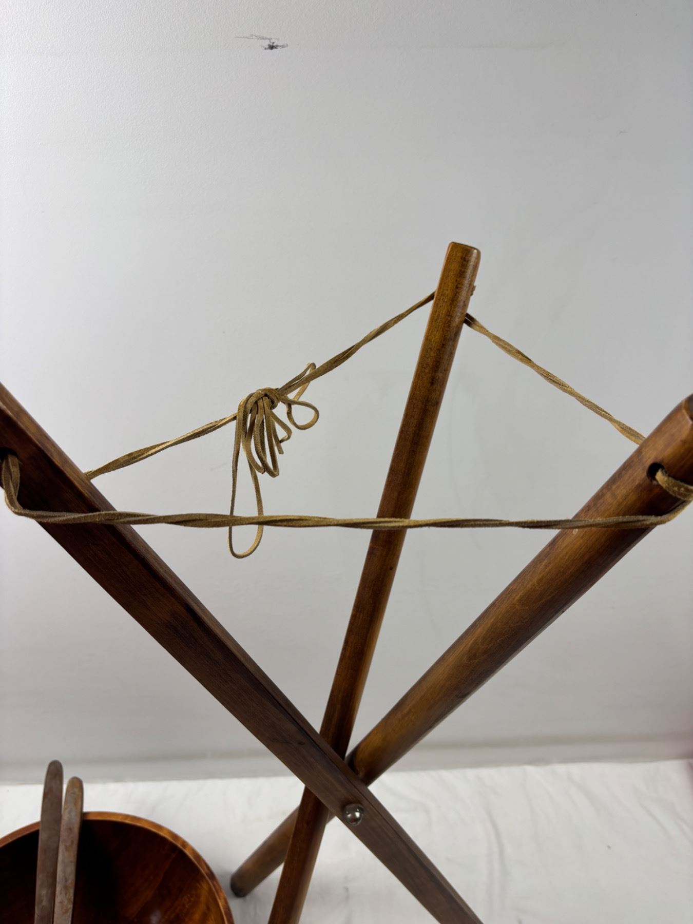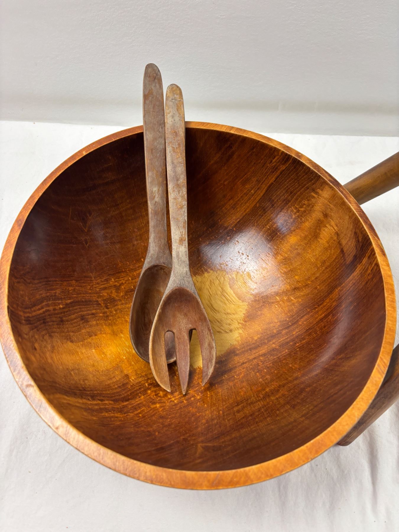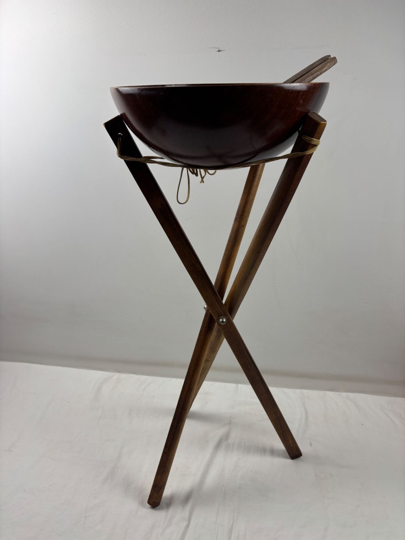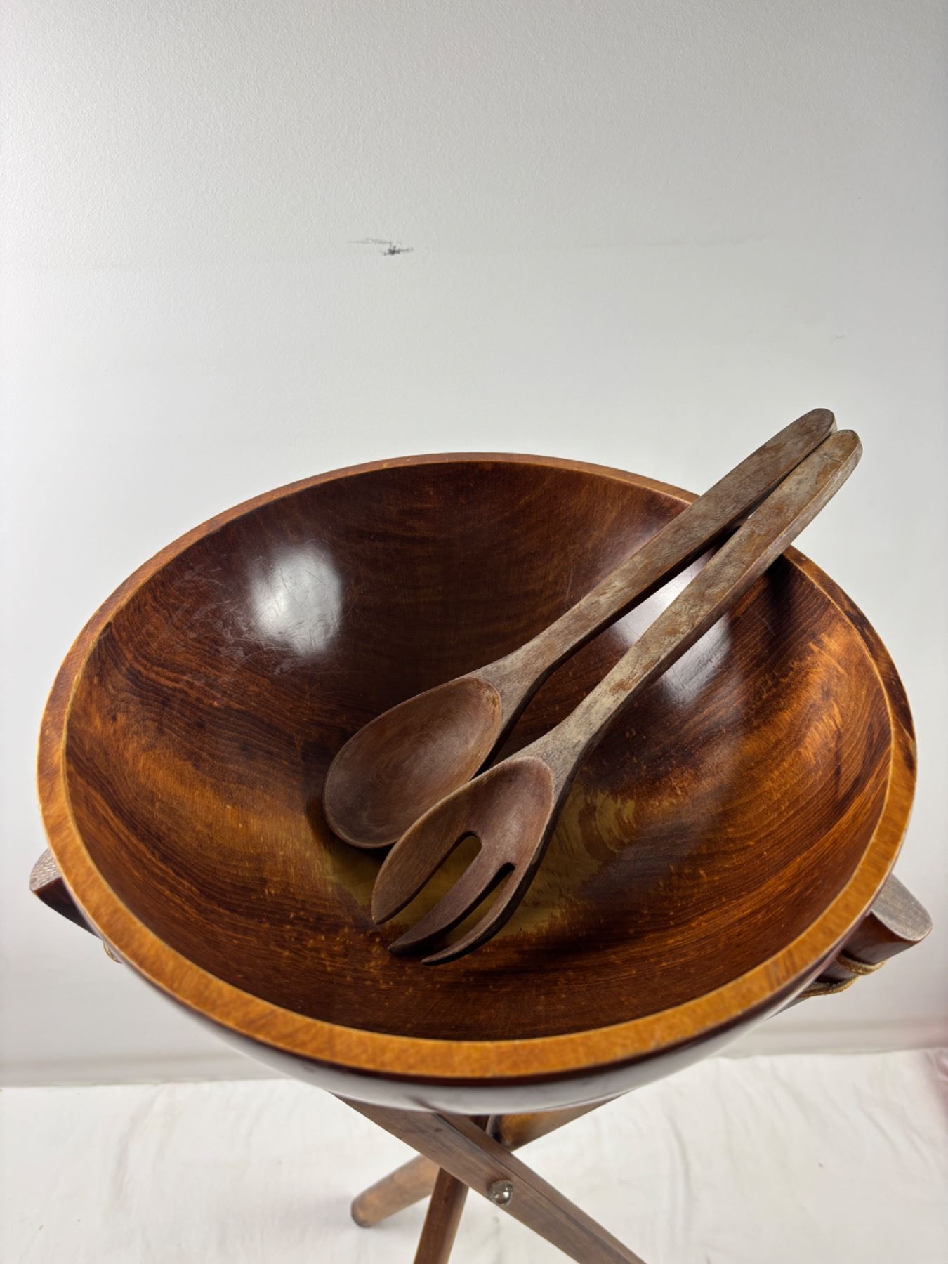 Some wear on the wooden bowl and salad utensils, Bowl is 25"diameter, Stand is 29"H