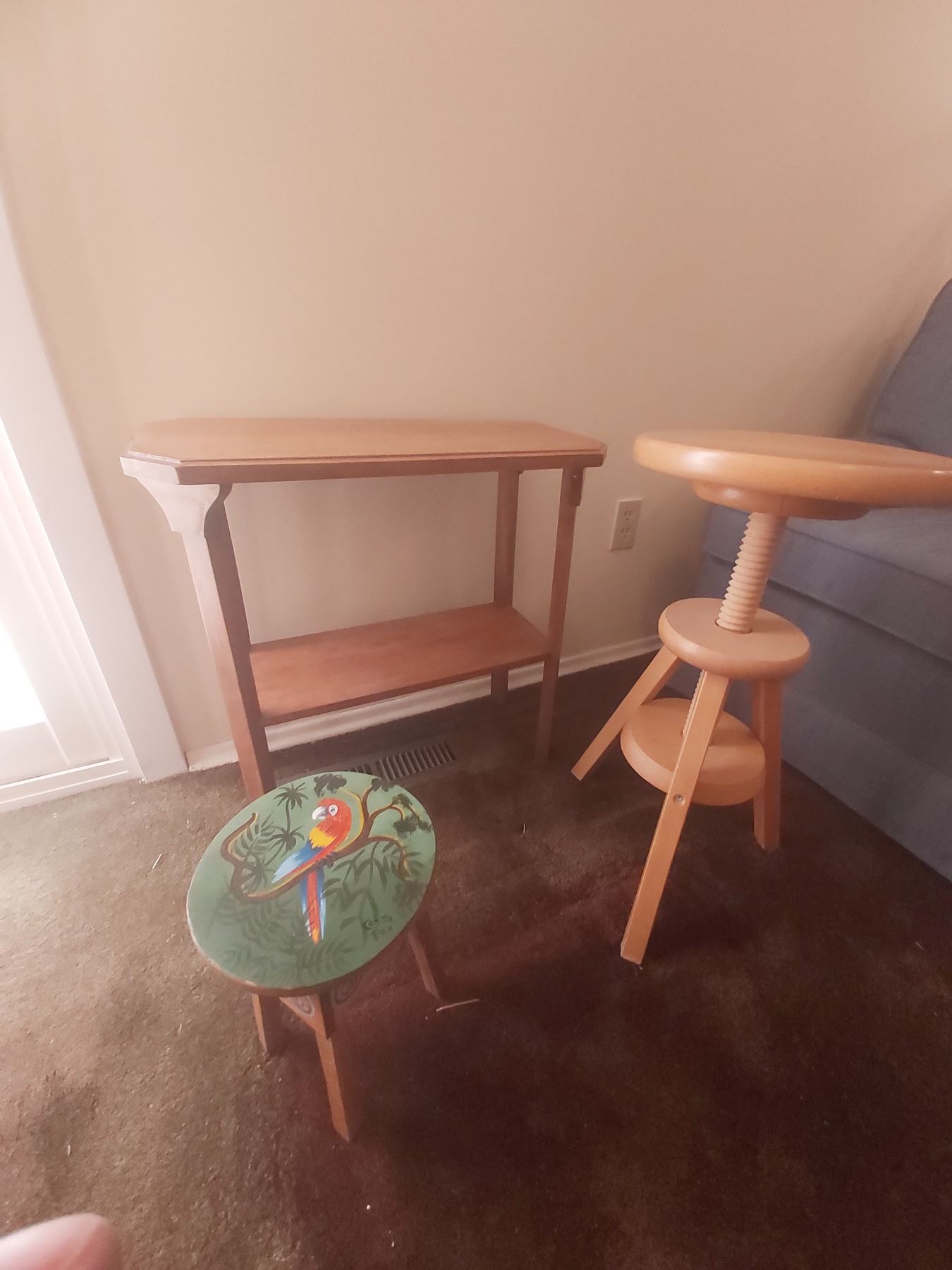 Small stool is from Costa Rica, Large sool is adjustable, Side Table; 22"L x 11"W x 22.5"H