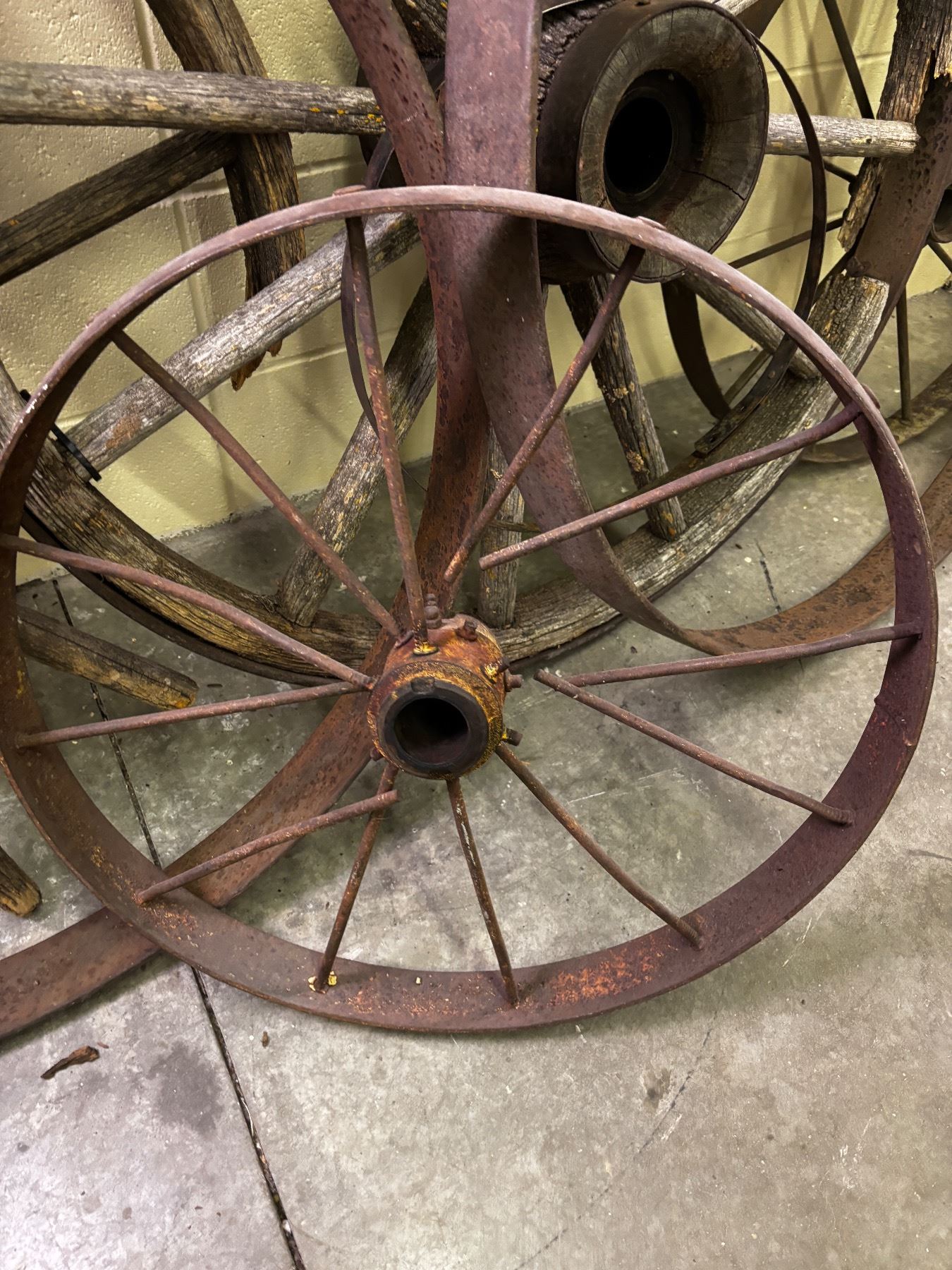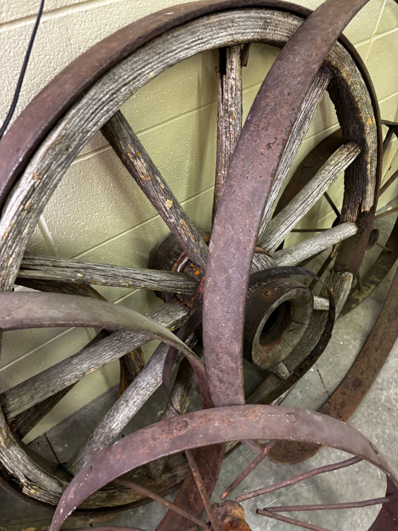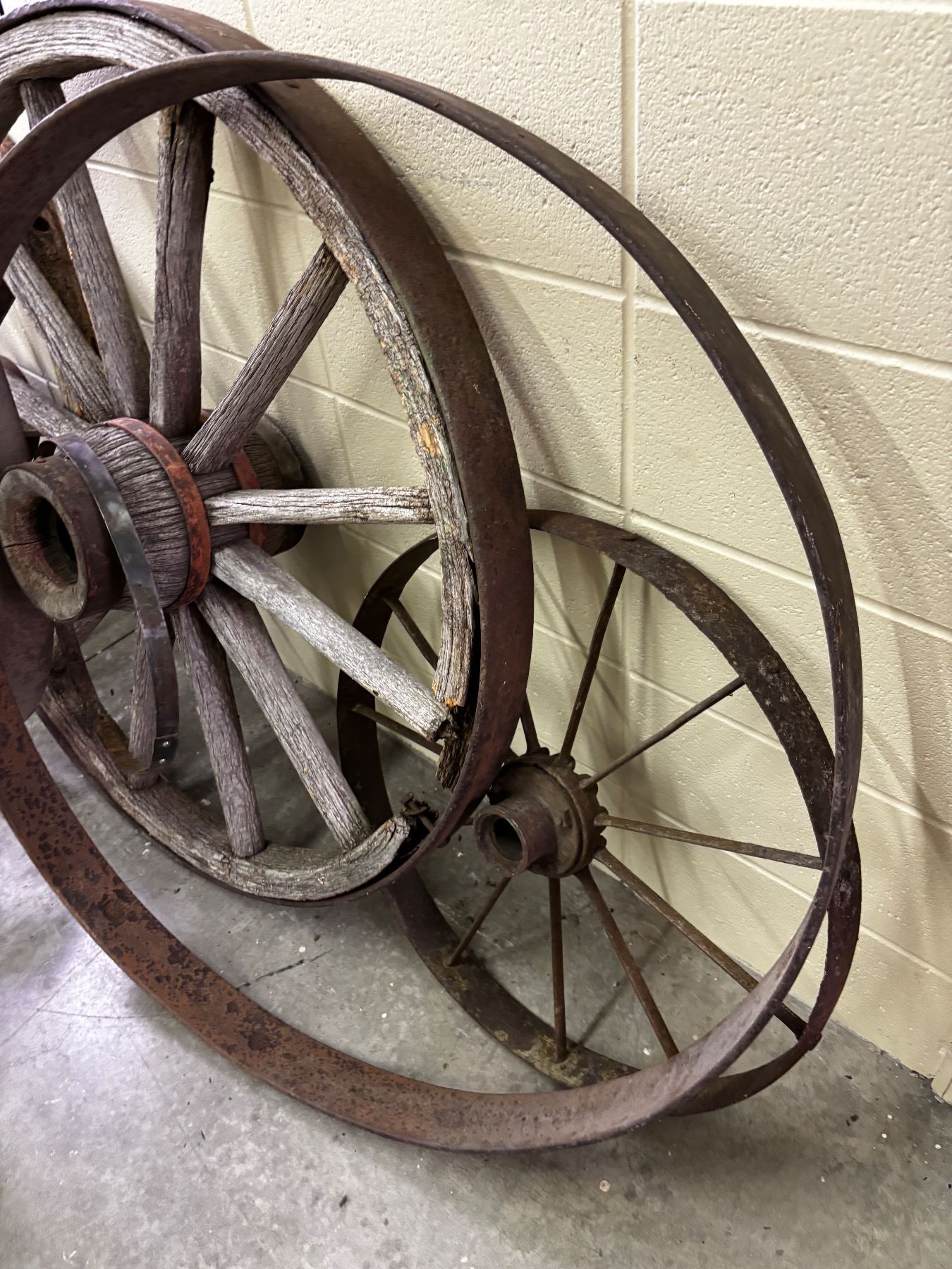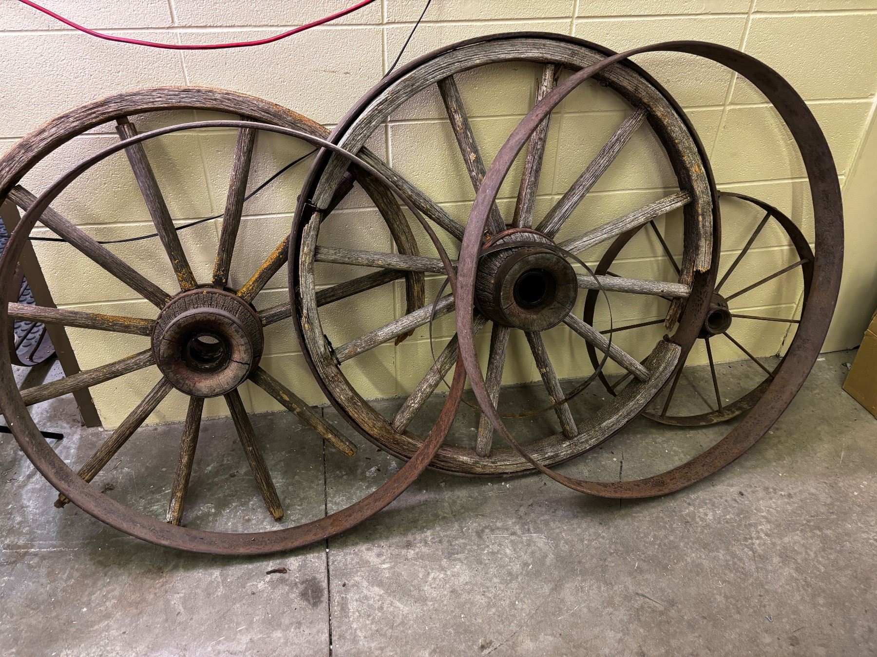 One wooden wheel is broken and missing the outer ring, Largest diameter is 40"