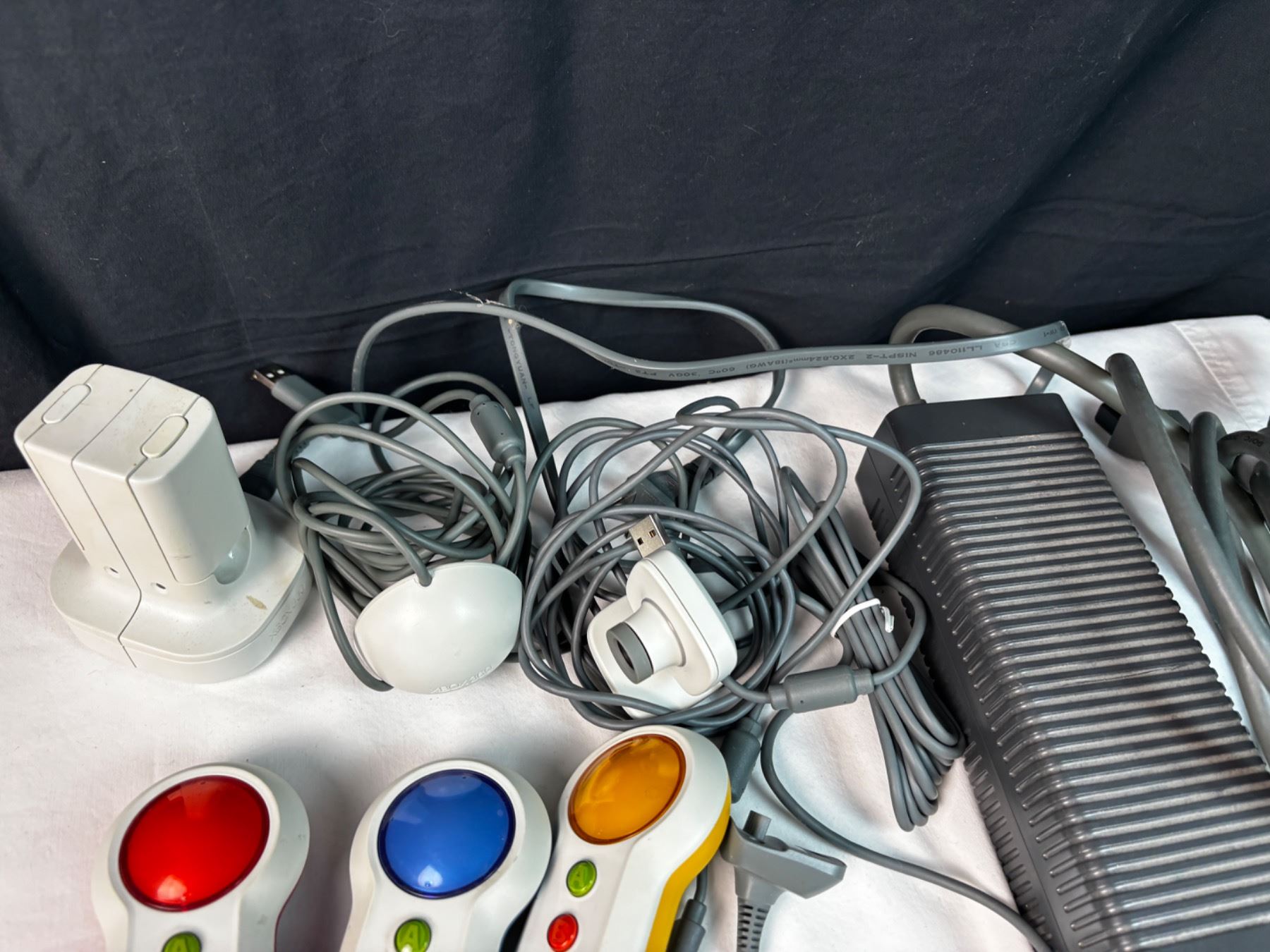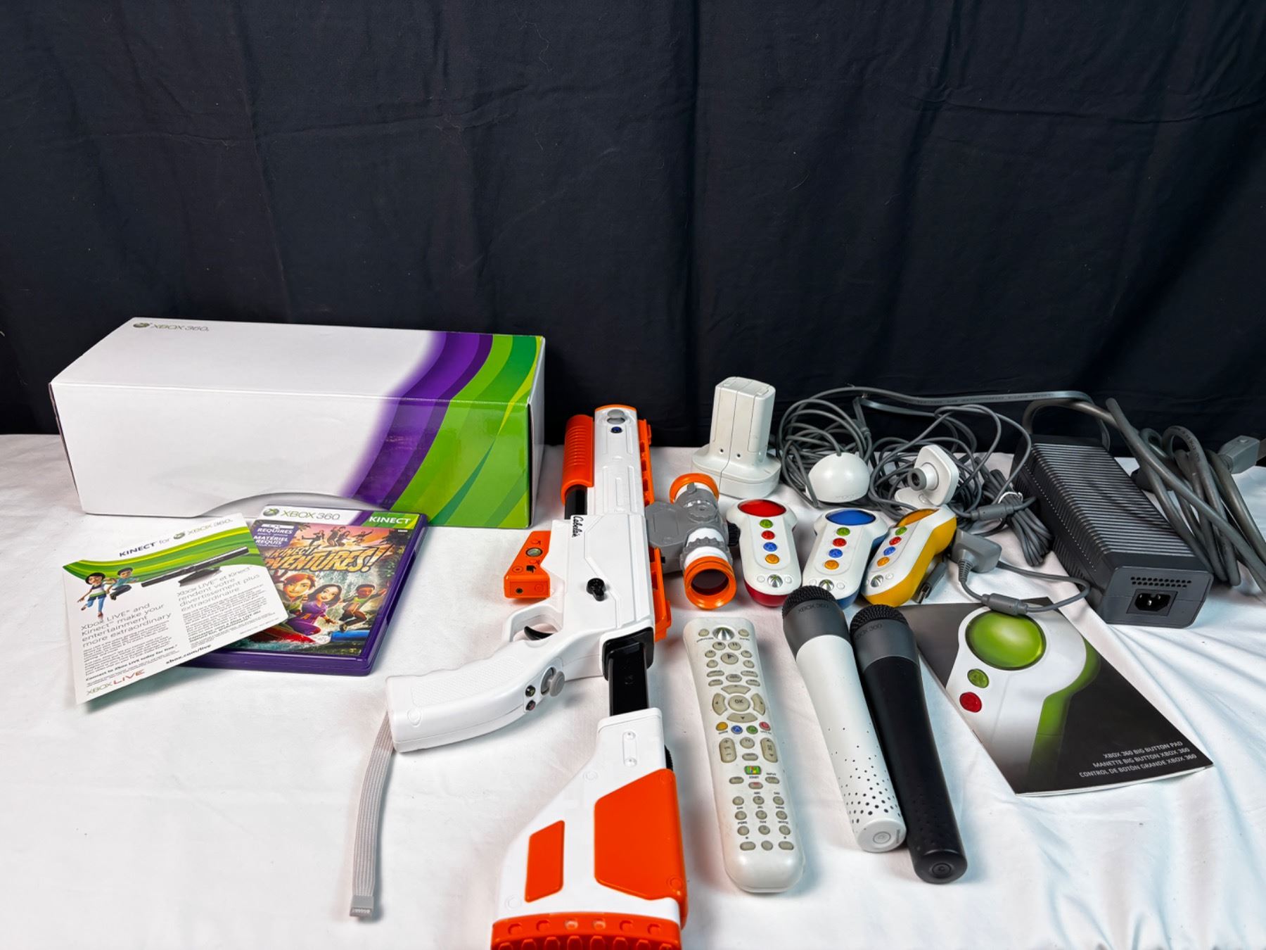Includes, Kinect for Xbox 360 (has power), Cabelas wireless controller, Xbox 360 Big Button Pad, and more