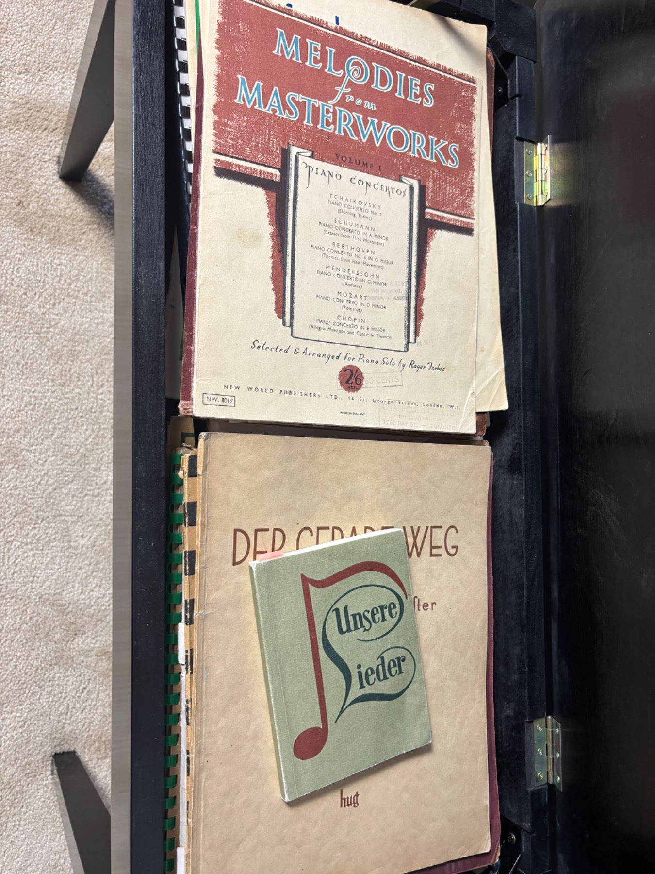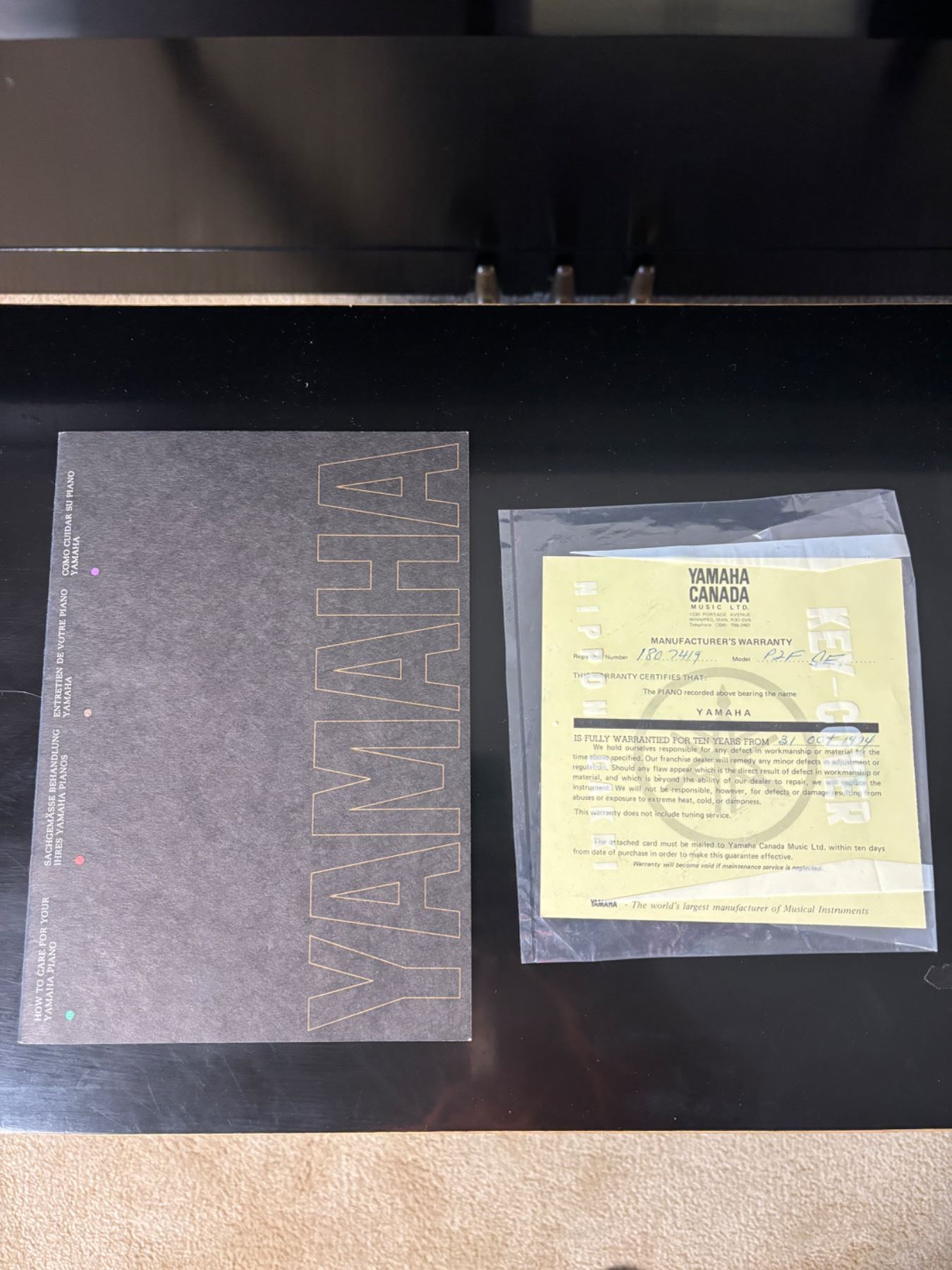 Includes the piano bench with an assortment of sheet music, Model No. P2FSE, #1807419